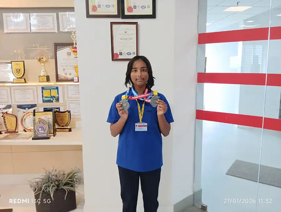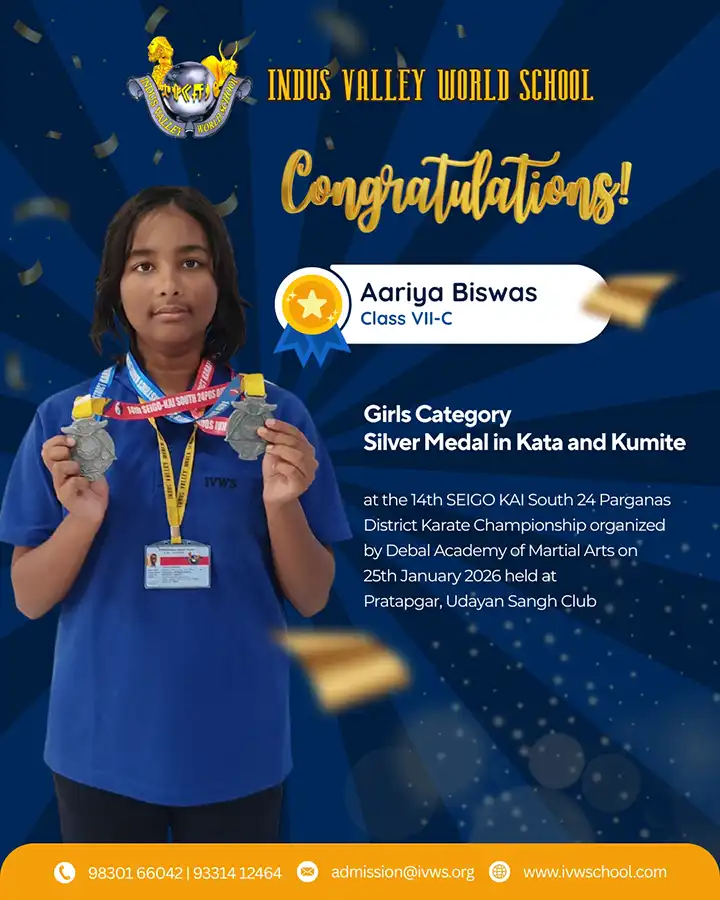 Aariya Biswas of Class VII, Section C, Girls category, participated in the 14th SEIGO KAI South 24 Parganas District Karate Championship, organized by Debal Academy of Martial Arts on 25th January 2026 at Pratapgar, Udayan Sangh Club. Showcasing exceptional skill and determination, she won Silver Medal in Kumite and Silver Medal in Kata, thereby making the school proud with her commendable performance.