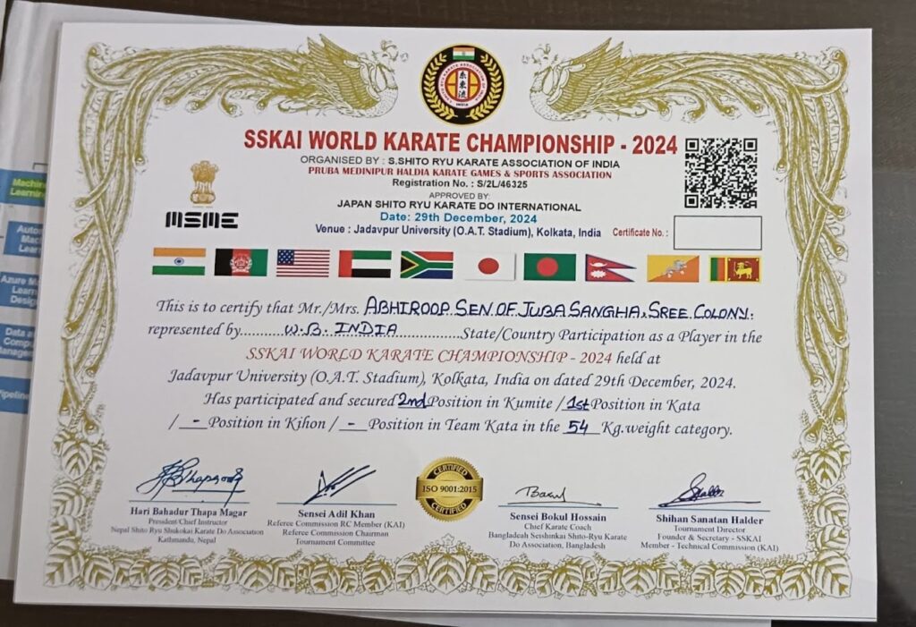 He recently participated in the (WORLD KARATE CHAMPIONSHIP 2024) held at (Jadavpur University O.A.T STADIUM) on (29th December 2024), and secured (1st position in Kata and 2nd position in Kumite in 54 kg weight category). This achievement is a testament to his dedication, discipline, and passion for Karate.