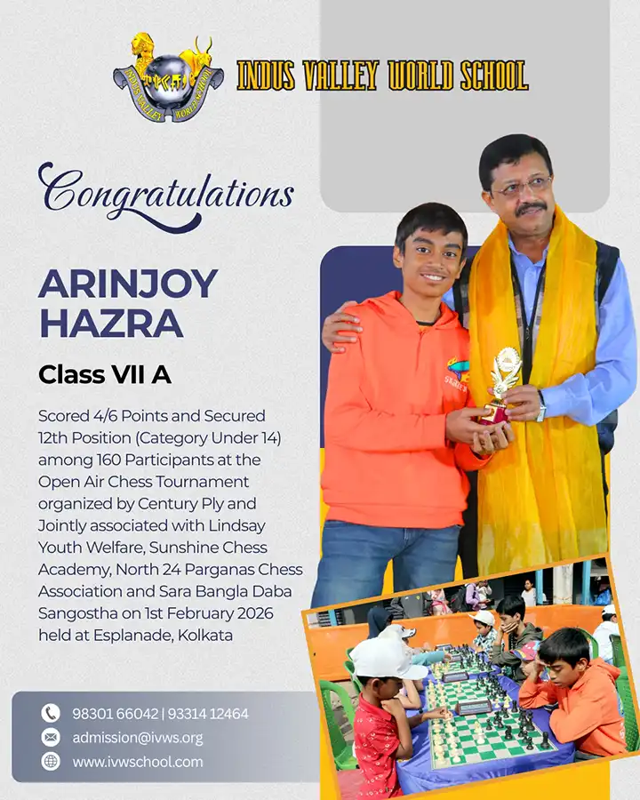 An Open Air Chess Tournament was organised by Century Ply jointly associated with Lindsay youth welfare, Sunshine Chess Academy, North 24 parganas Chess association and Sara Bangla Daba Sangostha on 1st Feb at Esplanade, Kolkata. There were total 160 Participants with different age groups showed their talents playing Chess of 6 rounds 15 mins each as per Swiss FIDE league. One of our students Arinjoy Hazra Grade-7(A) has participated in this and won a prize for scoring 4/6 and hold 12th Position in under 14 category
