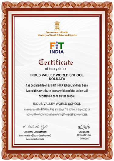 Indus Valley World School is proud to receive the “FIT INDIA” Certificate of Recognition from the Government of India, Ministry of Youth Affairs and Sports.