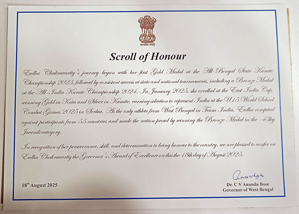 IVWS is privileged to share proudly that Eedha Chakravartty of class 8D has been conferred with the Governor’s Award of Excellence 2025 on 18th August 2025 for her achievement at the International level by clinching a Bronze Medal in the ISF Gymnasiade U-15 World School Combat Games 2025 in Serbia, Europe.