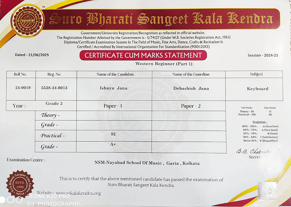 Indus Valley World School is proud to share that our talented student, Ishayu Jana of Grade 5B, has performed brilliantly in his recent music examination in the keyboard category, conducted by Suro Bharati Sangeet Kala Kendra through Nayabad School of Music.