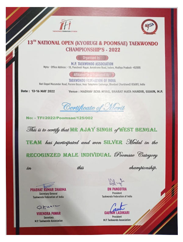 We are delighted to celebrate the achievement of our faculty Ajay Kumar Singh in the 13th Open National Taekwondo Championship held in Ujjain from 14th-16th May 2022. He received the Silver medal at the All India level! Congratulations Sir!