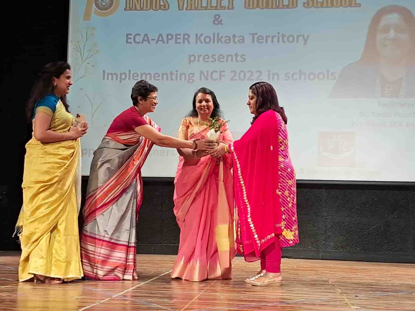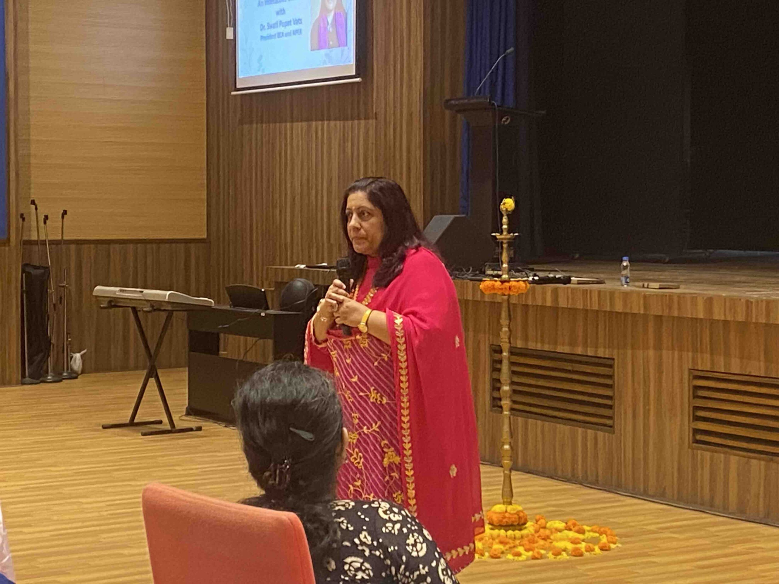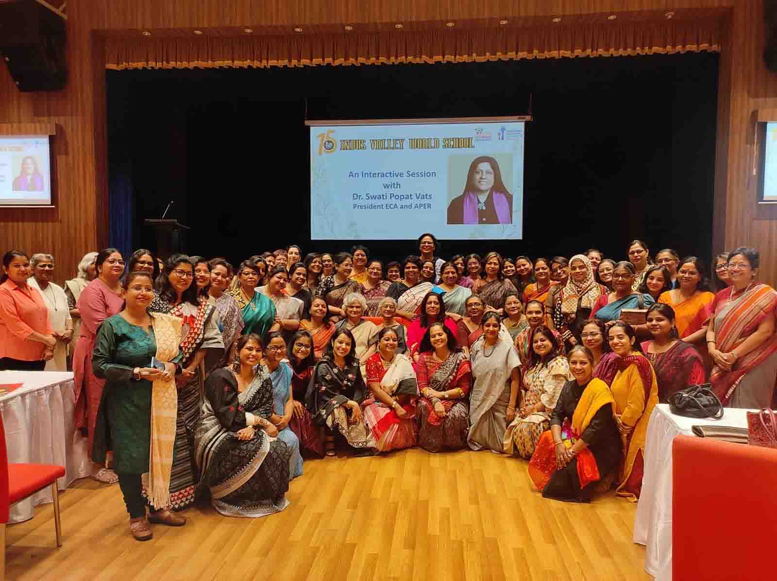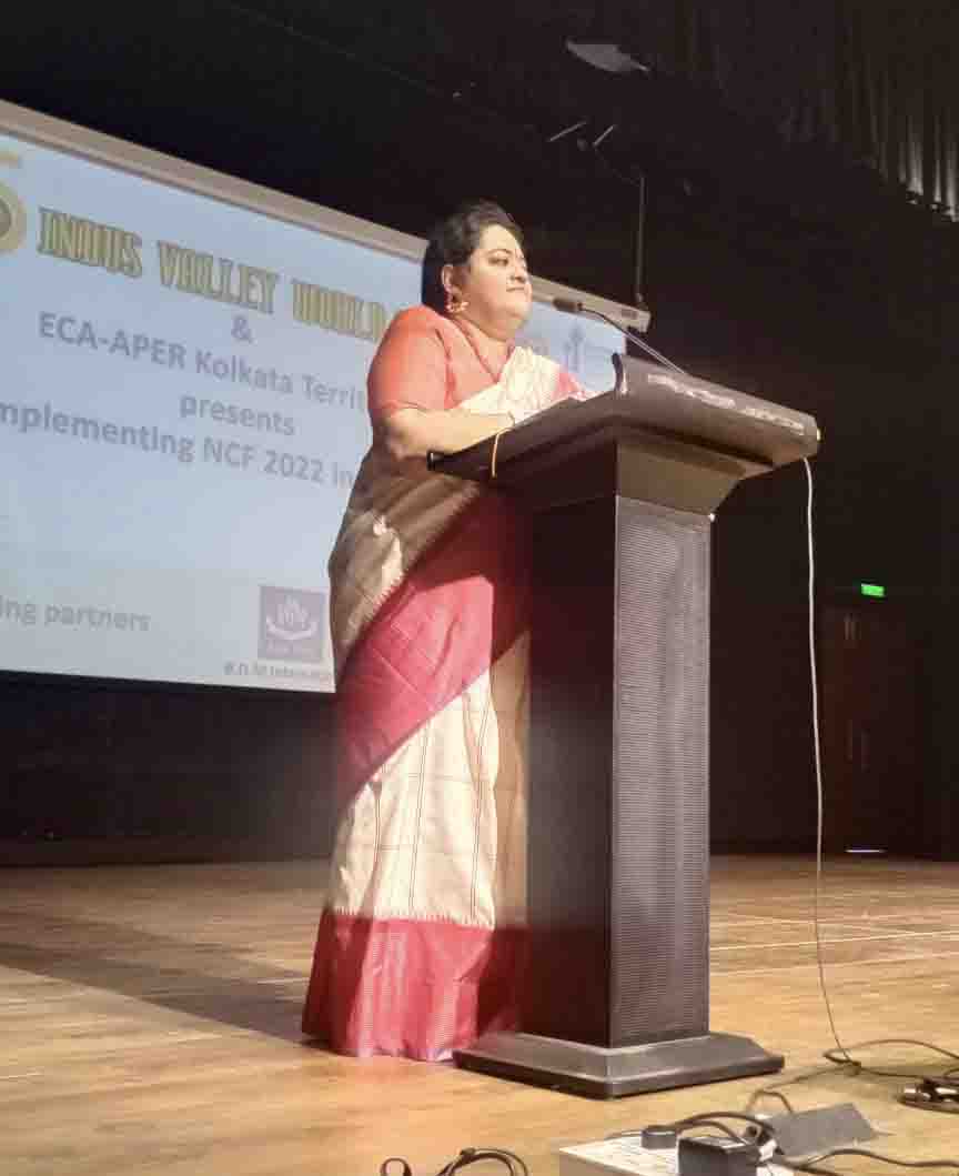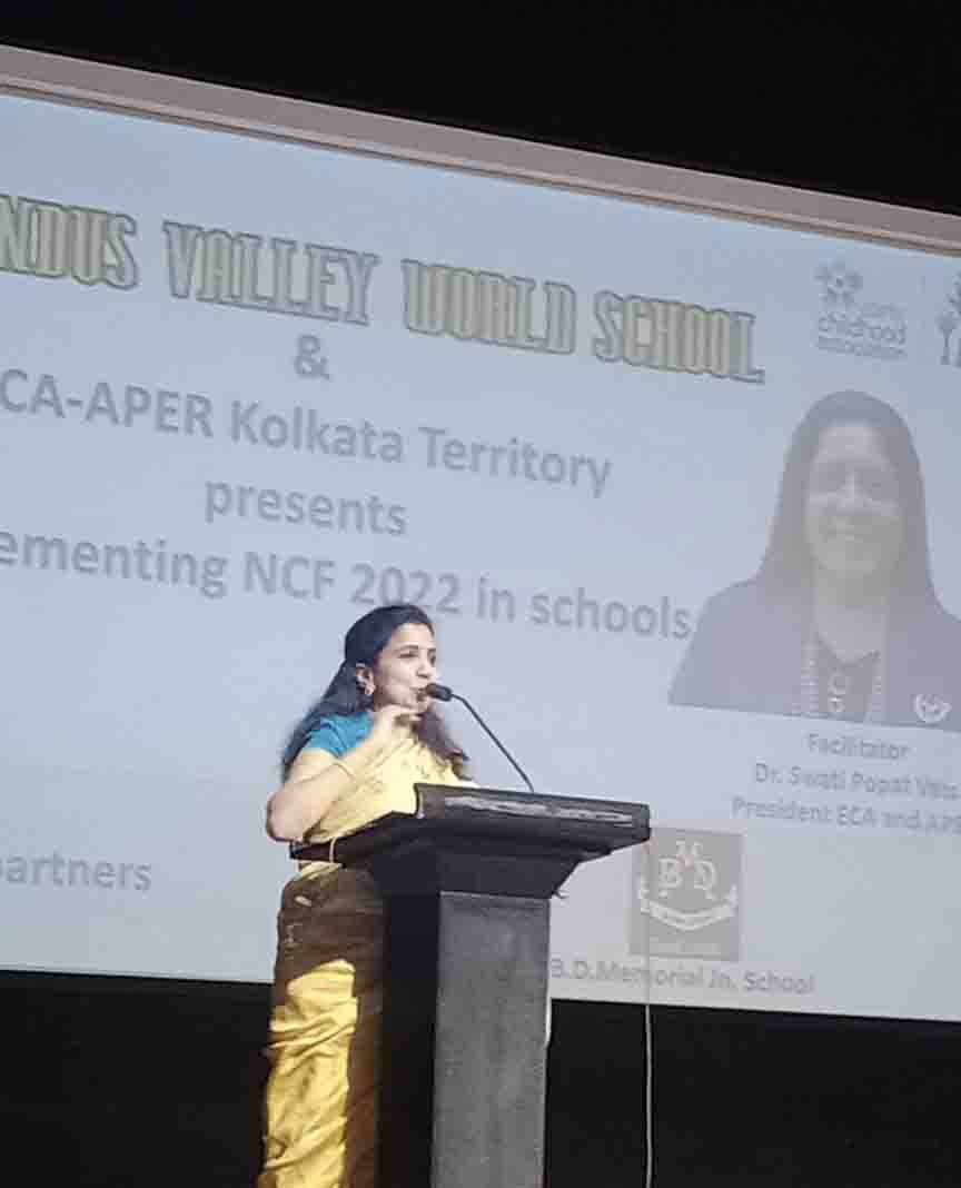 On 11th February 2023, Indus Valley World School welcomed the iconic educator Dr. Swati Popat Vats. The day long programme began with the traditional lighting of the lamp as Dr. Vats was welcomed to Kolkata. The morning session saw the charismatic Dr. Popat Vats discuss the main features of the NCF with nearly 90 teachers from across the city. The three hour session had every teacher present in the auditorium riveted to their seats. The afternoon saw an interactive session with city school leaders as Dr. Vats discussed and debated about how to straddle the new challenges thrown up in the sphere of education. She emphasised the collective strength that leaders in education can display by sharing a common vision.