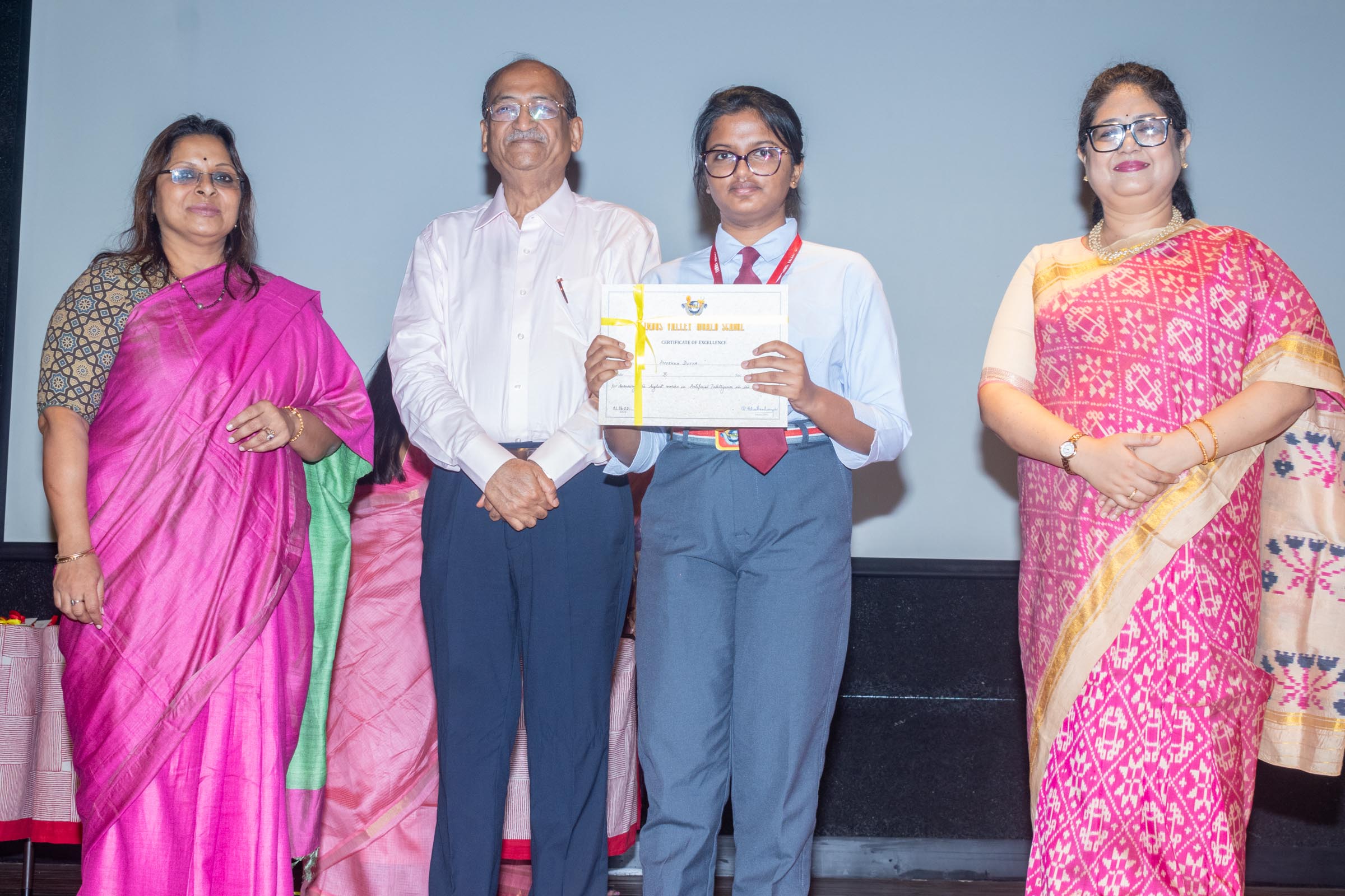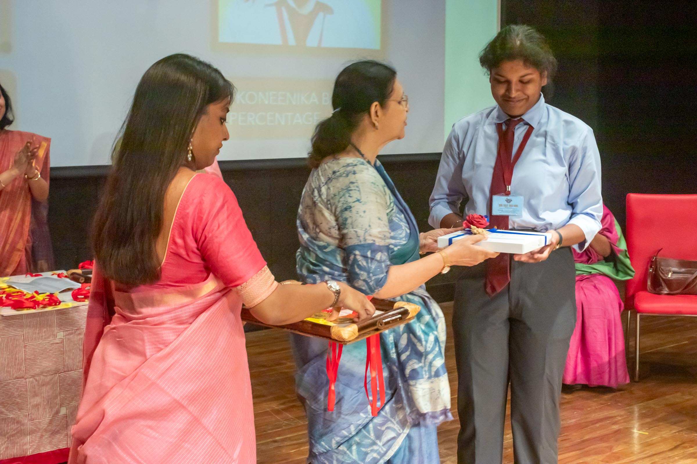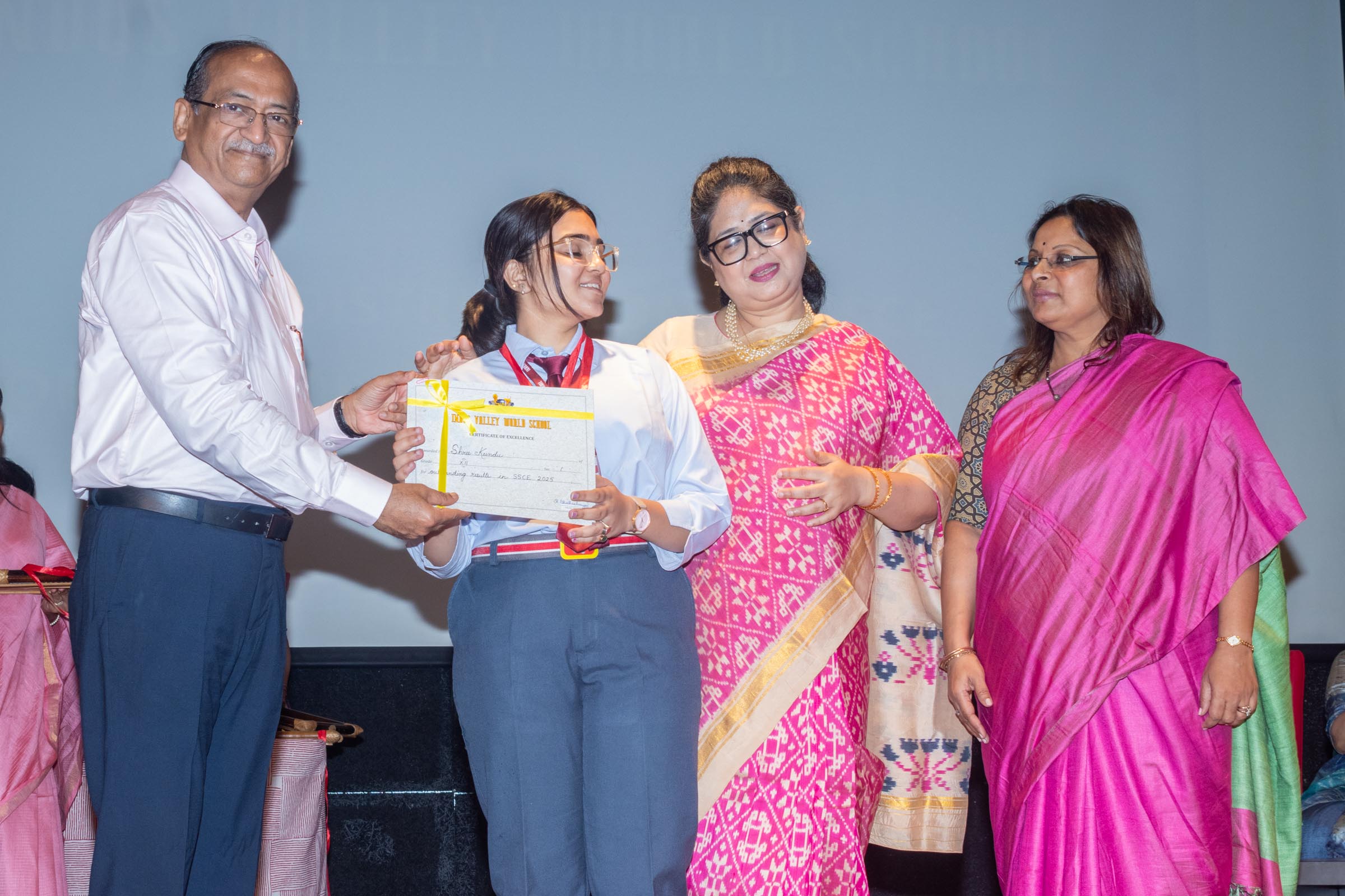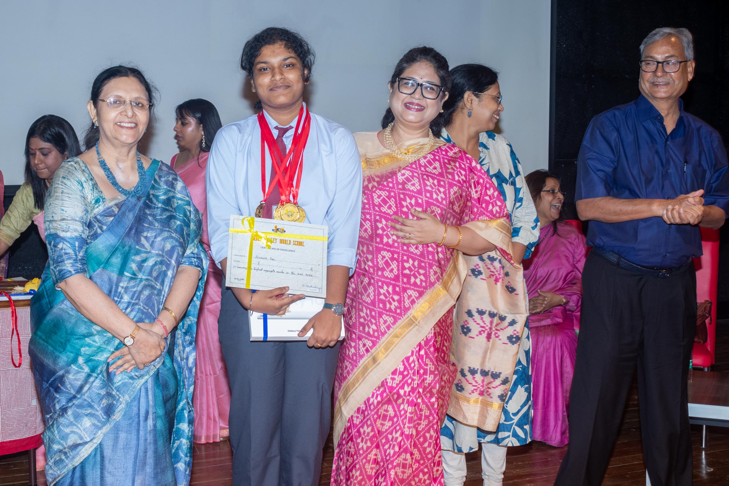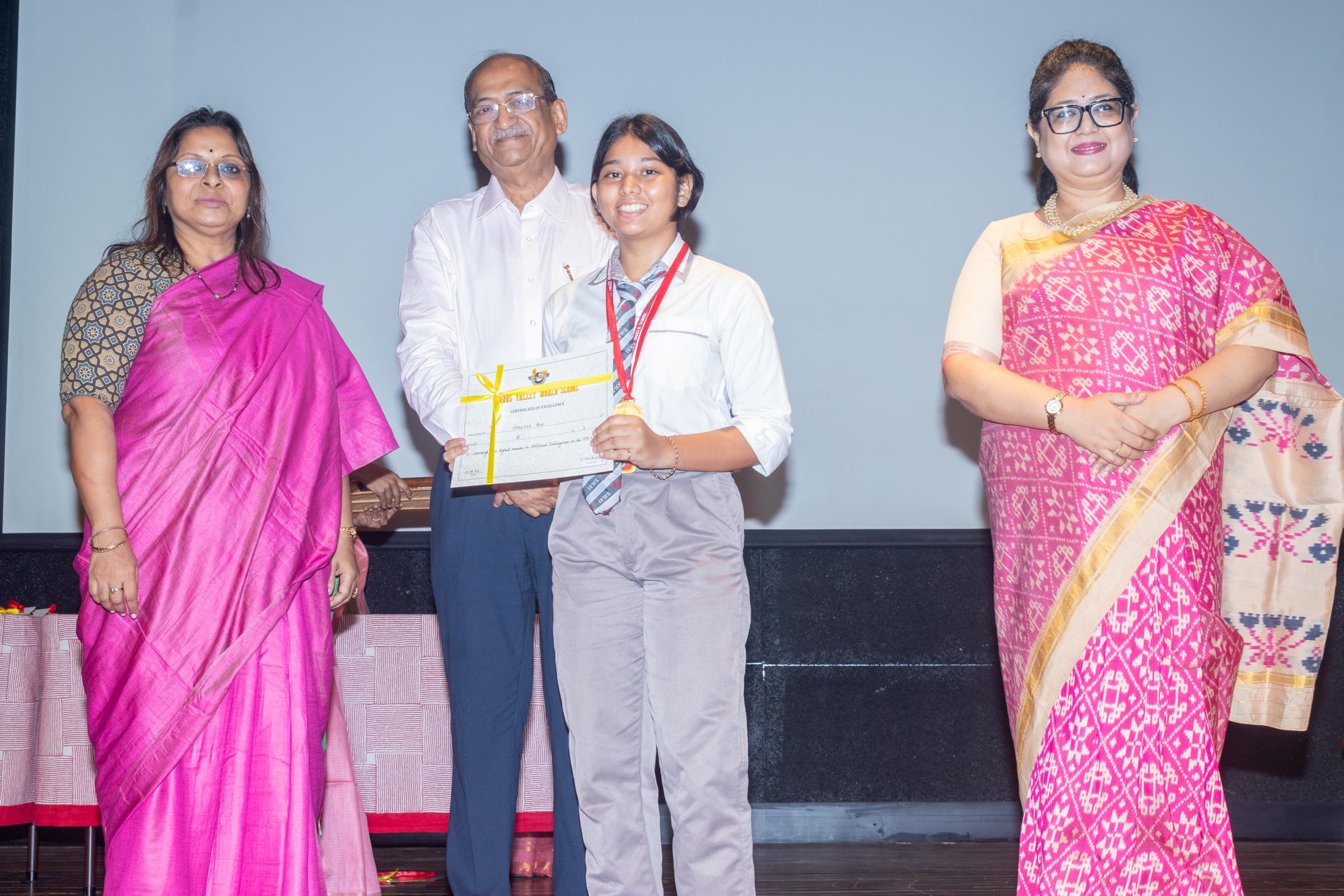 In the welcome address, Mrs Bhattacharya congratulated and appreciated the efforts of the students on their stellar performance in the boards and set the tone for the day. After the soulful rendition of the prayer song, students enthralled the audience by presenting Ganesh Vandana through their impeccable dance performance. Amidst a huge round of applause, the honoured guests and dignitaries were felicitated on stage by the Principal, Vice Principal and Mr S.L Gupta. The students displayed unabated excitement as the overall board toppers of grade X, Diyasmi Pal and grade XII, Koneenika Basak were felicitated with tabs, medals and certificates for scoring a whopping 98.8% and 99.2% respectively. Then it was the turn of the 34 high achievers being recognized for their stupendous aggregate of 95% and above followed by the subject toppers, many of whom scored a perfect 100 in subjects like Mathematics, Science, AI, Psychology, Sociology, Commercial Art, Home Science and Informatics Practices.