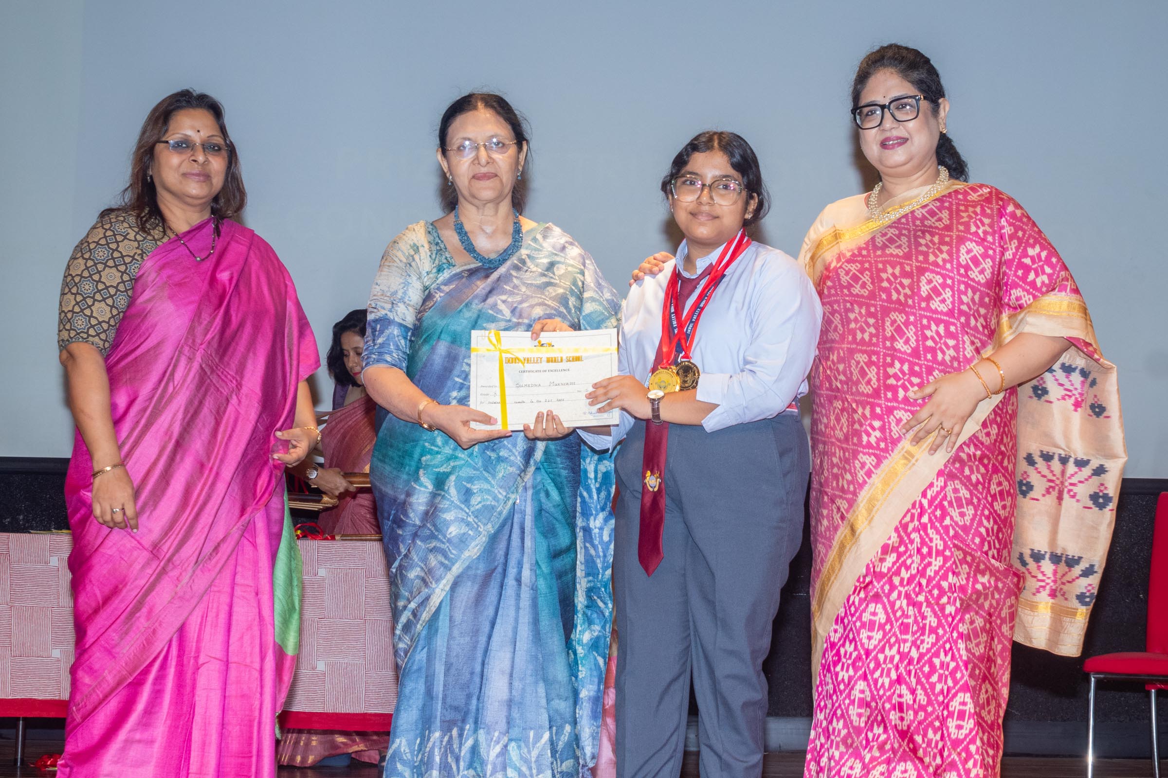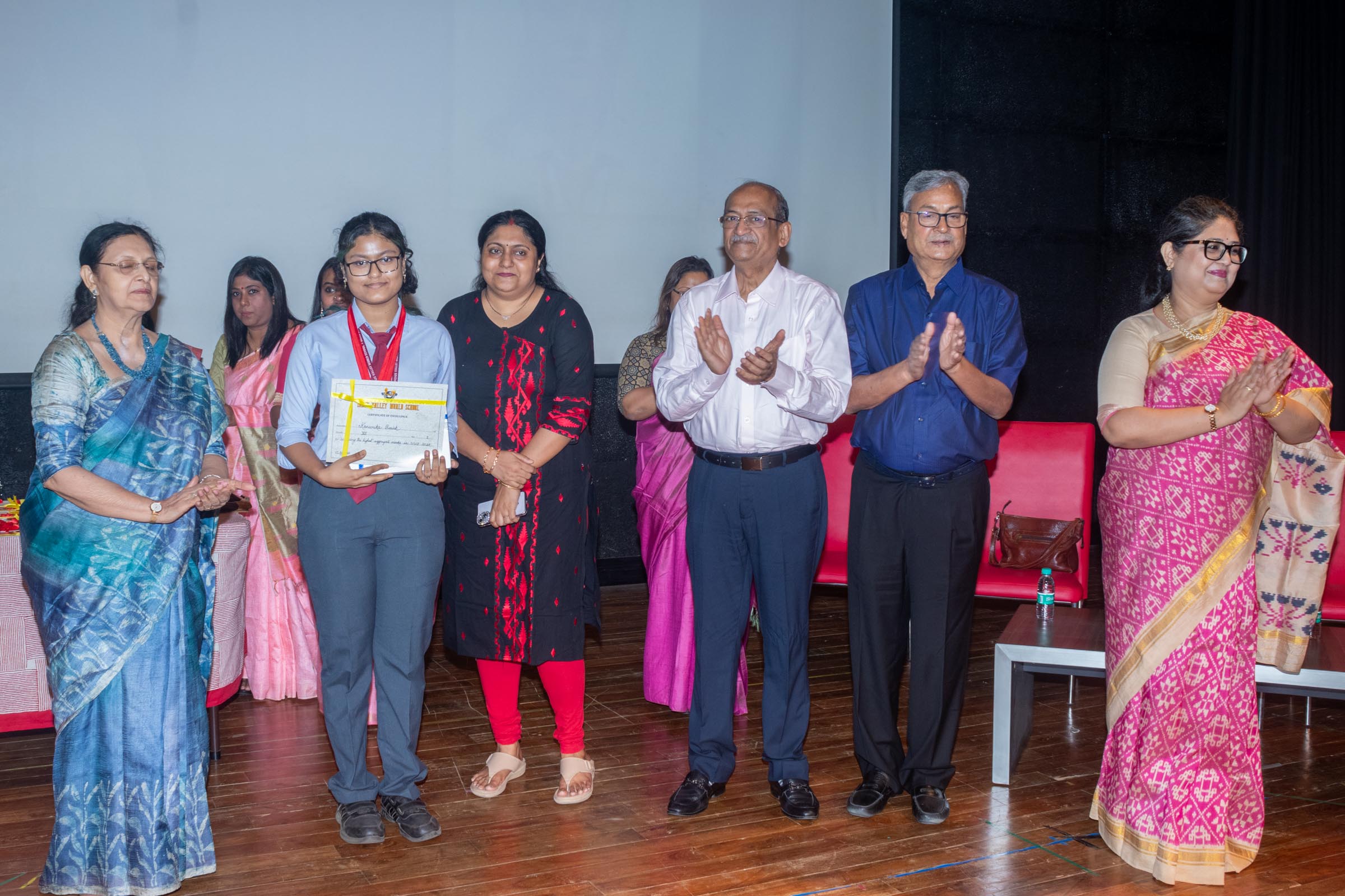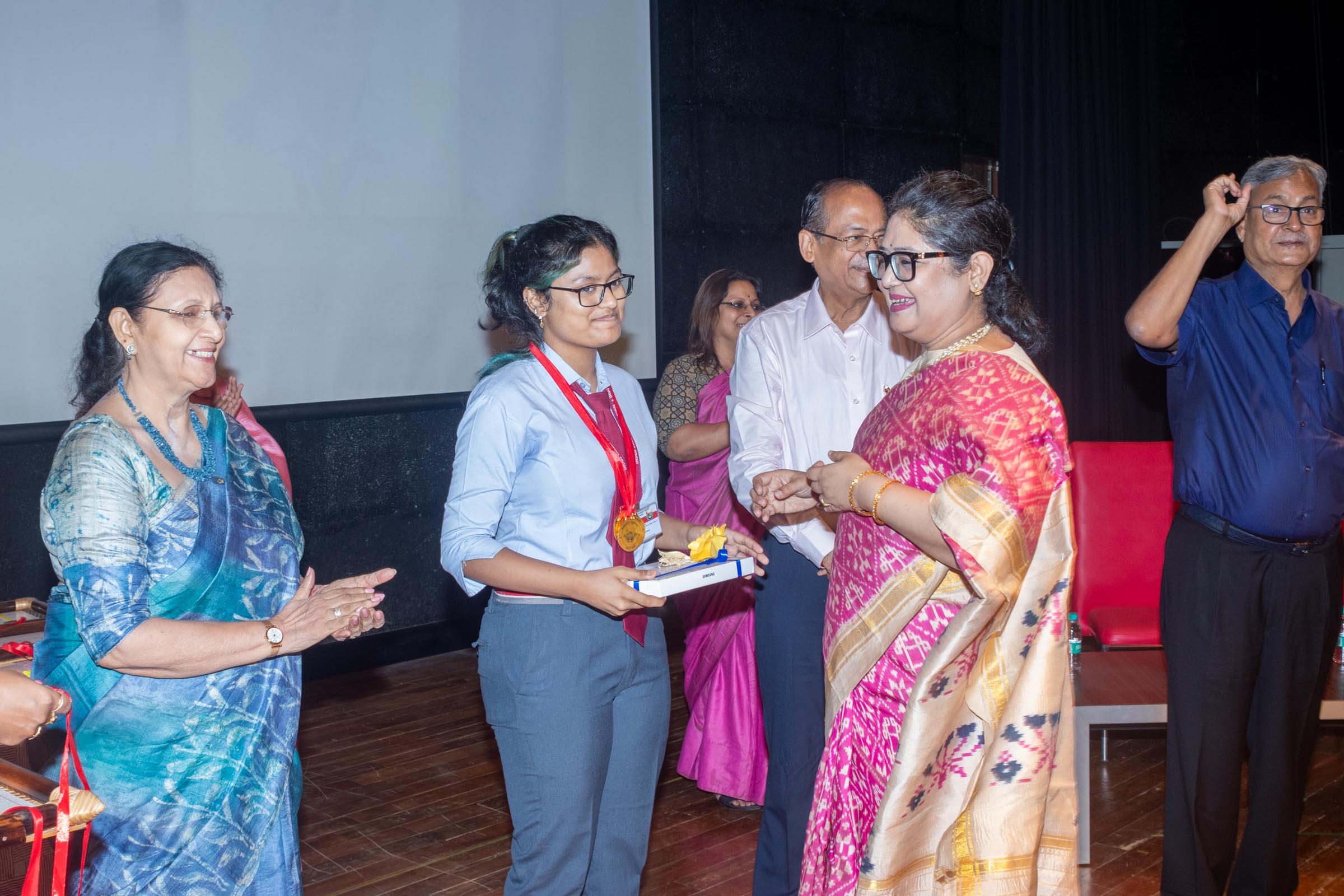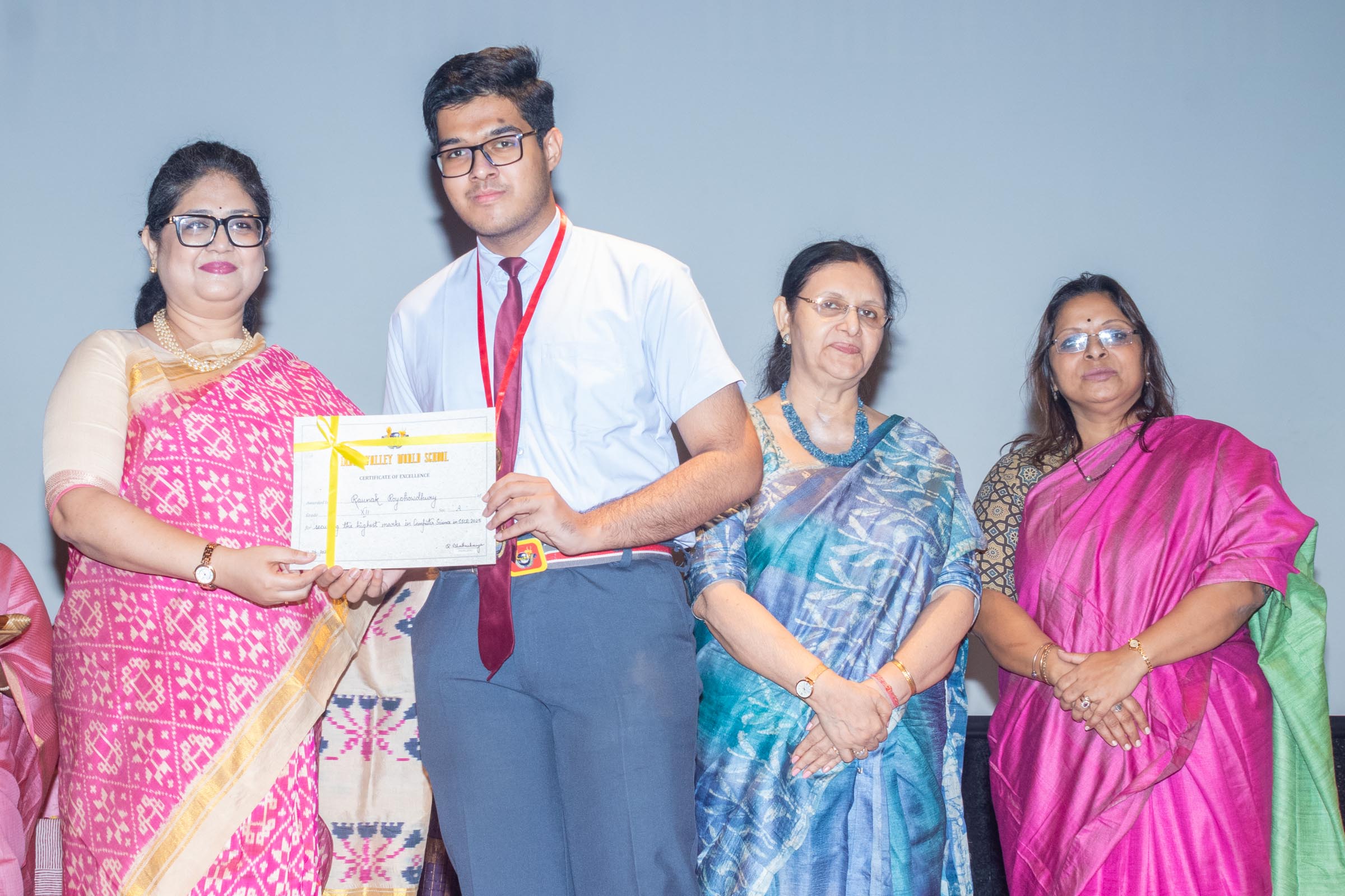 In the welcome address, Mrs Bhattacharya congratulated and appreciated the efforts of the students on their stellar performance in the boards and set the tone for the day. After the soulful rendition of the prayer song, students enthralled the audience by presenting Ganesh Vandana through their impeccable dance performance. Amidst a huge round of applause, the honoured guests and dignitaries were felicitated on stage by the Principal, Vice Principal and Mr S.L Gupta. The students displayed unabated excitement as the overall board toppers of grade X, Diyasmi Pal and grade XII, Koneenika Basak were felicitated with tabs, medals and certificates for scoring a whopping 98.8% and 99.2% respectively. Then it was the turn of the 34 high achievers being recognized for their stupendous aggregate of 95% and above followed by the subject toppers, many of whom scored a perfect 100 in subjects like Mathematics, Science, AI, Psychology, Sociology, Commercial Art, Home Science and Informatics Practices.