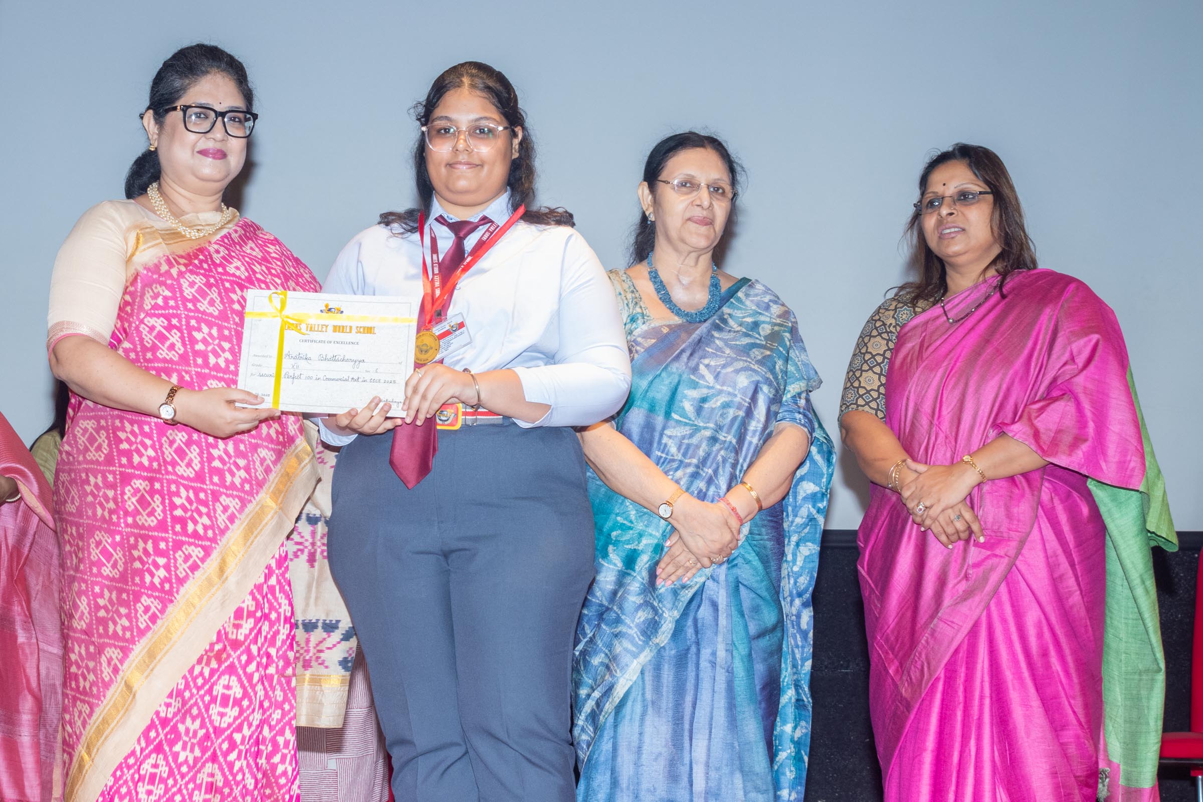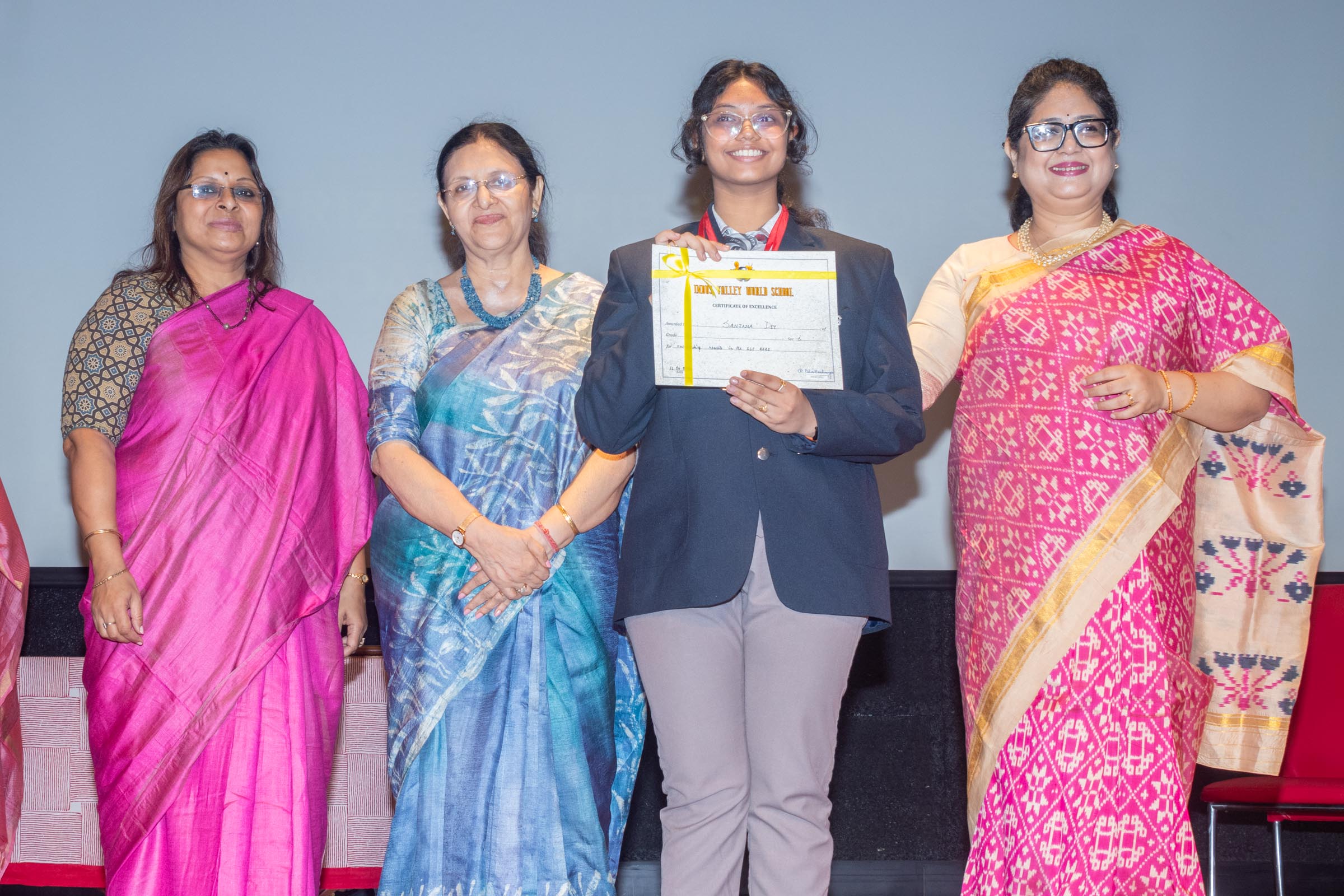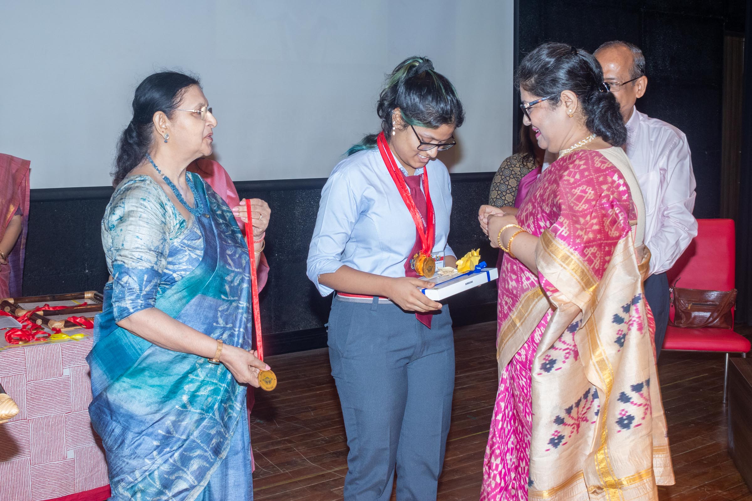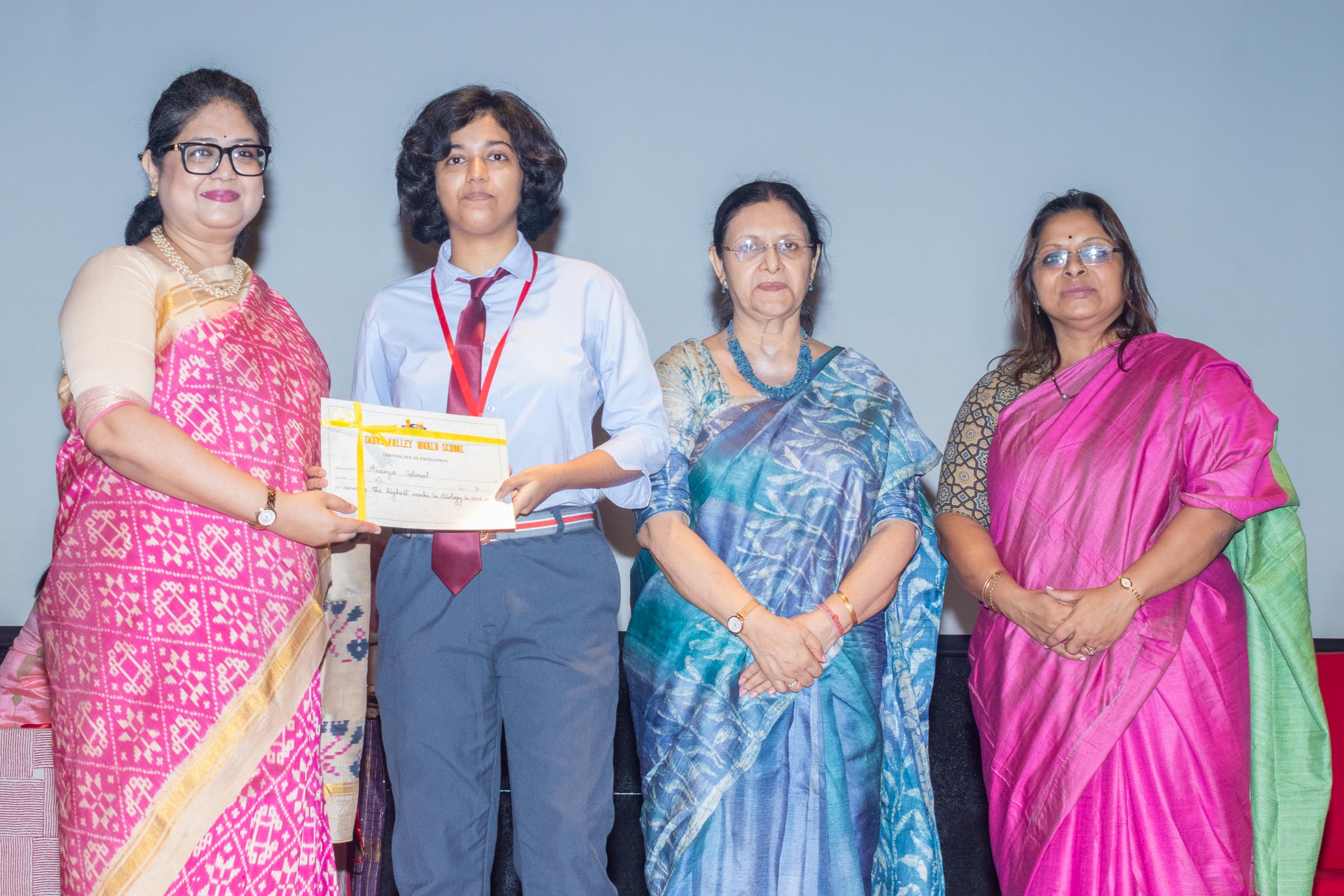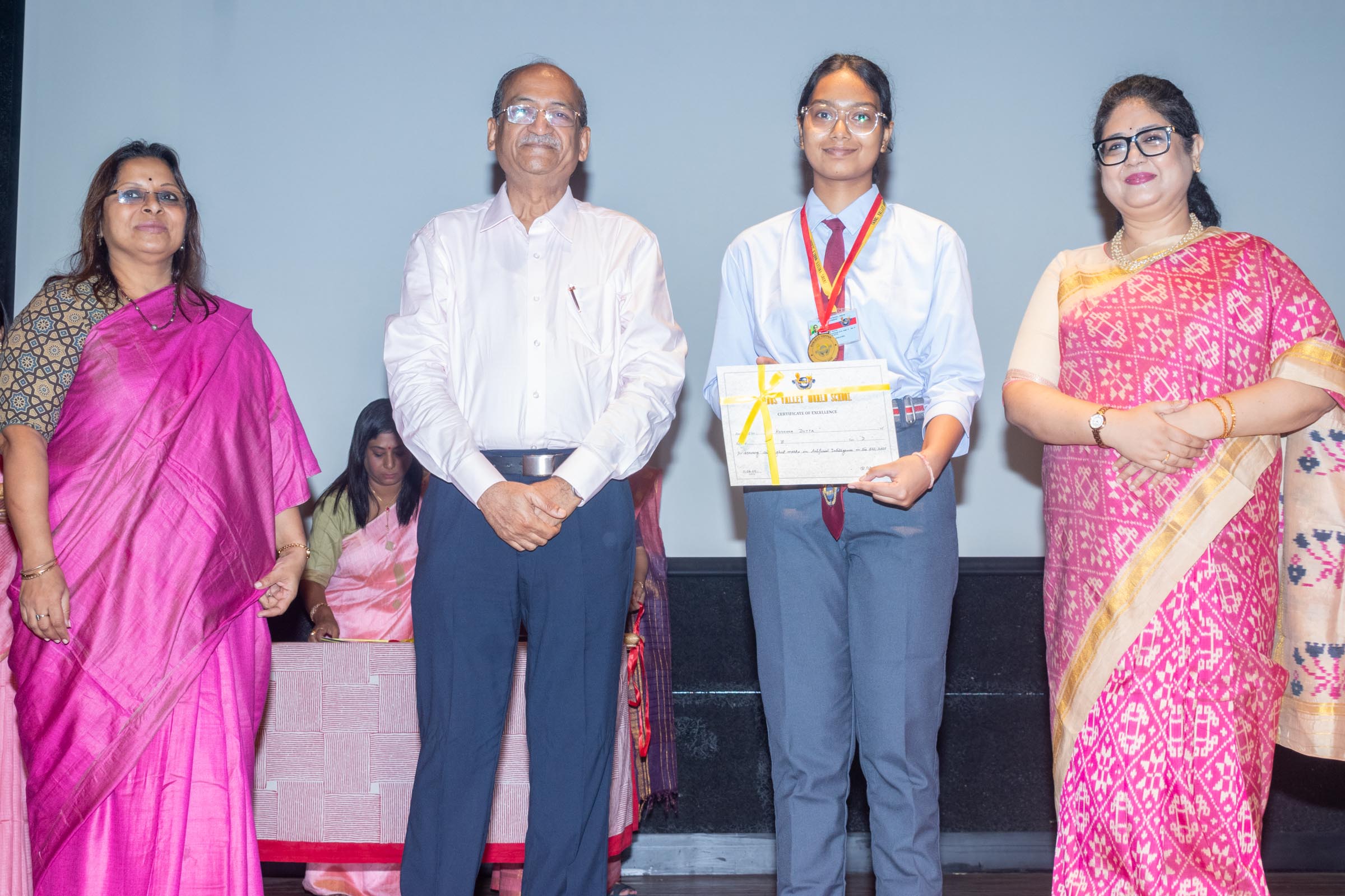 In the welcome address, Mrs Bhattacharya congratulated and appreciated the efforts of the students on their stellar performance in the boards and set the tone for the day. After the soulful rendition of the prayer song, students enthralled the audience by presenting Ganesh Vandana through their impeccable dance performance. Amidst a huge round of applause, the honoured guests and dignitaries were felicitated on stage by the Principal, Vice Principal and Mr S.L Gupta. The students displayed unabated excitement as the overall board toppers of grade X, Diyasmi Pal and grade XII, Koneenika Basak were felicitated with tabs, medals and certificates for scoring a whopping 98.8% and 99.2% respectively. Then it was the turn of the 34 high achievers being recognized for their stupendous aggregate of 95% and above followed by the subject toppers, many of whom scored a perfect 100 in subjects like Mathematics, Science, AI, Psychology, Sociology, Commercial Art, Home Science and Informatics Practices.