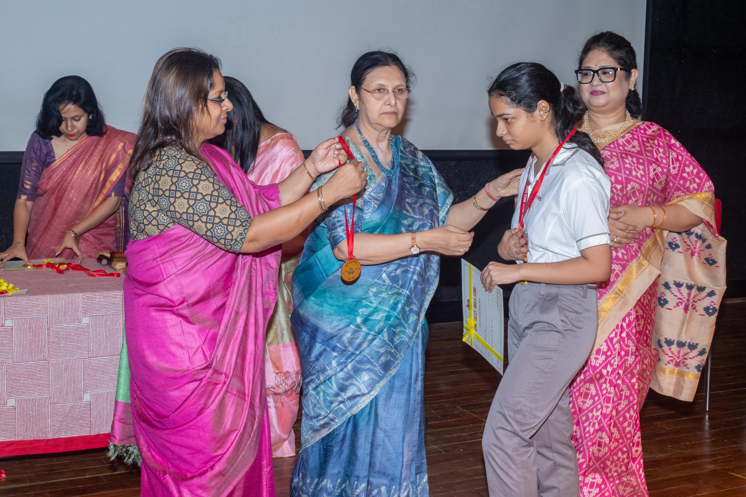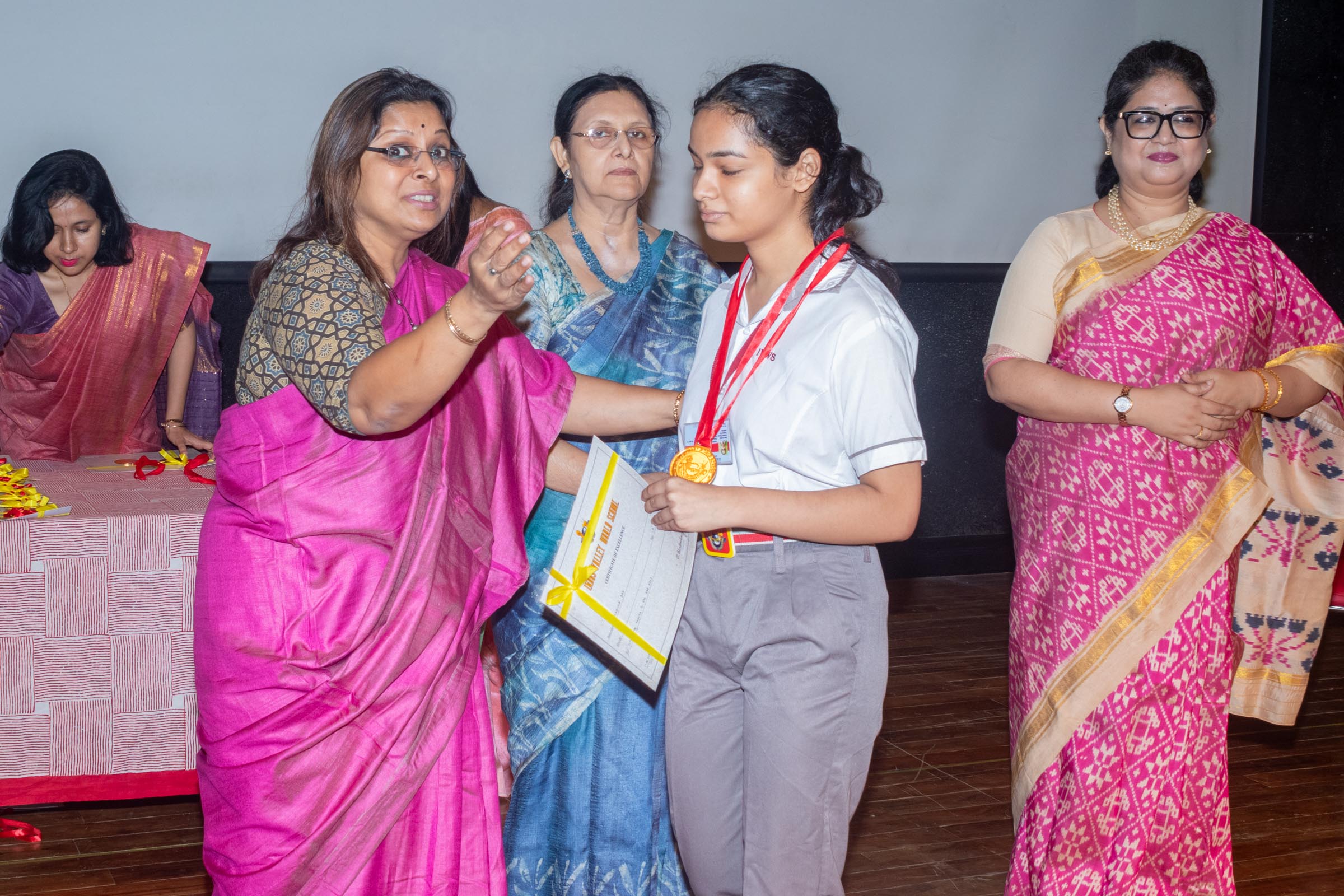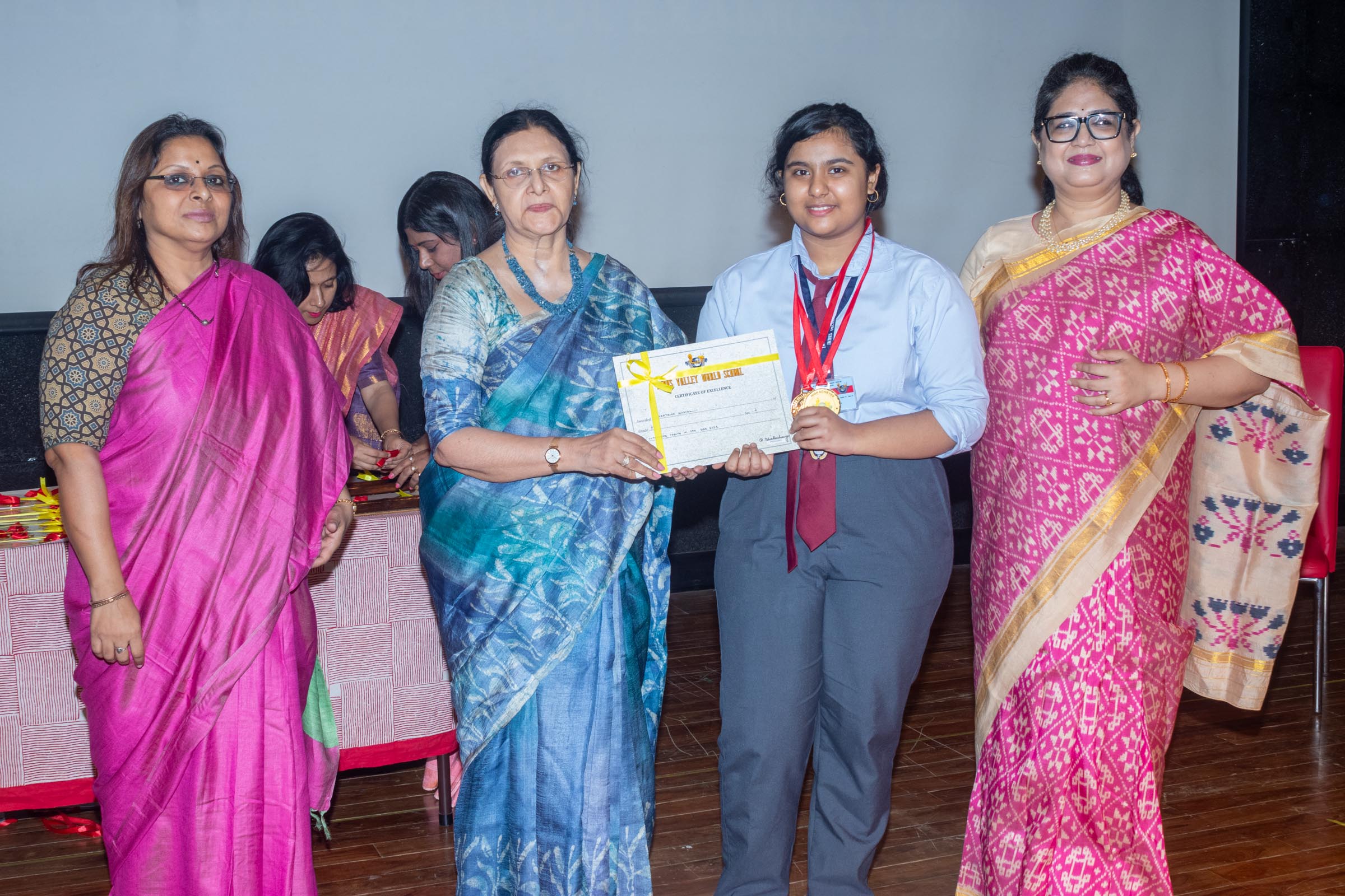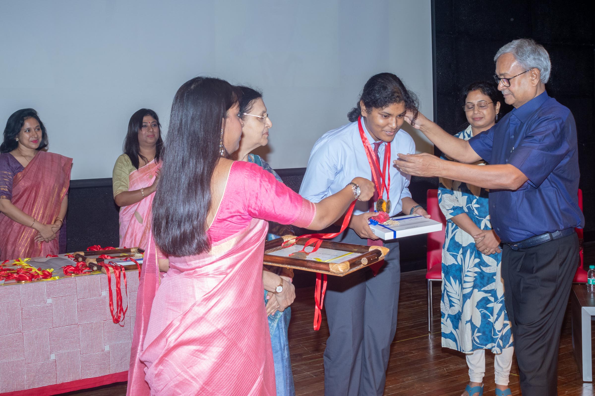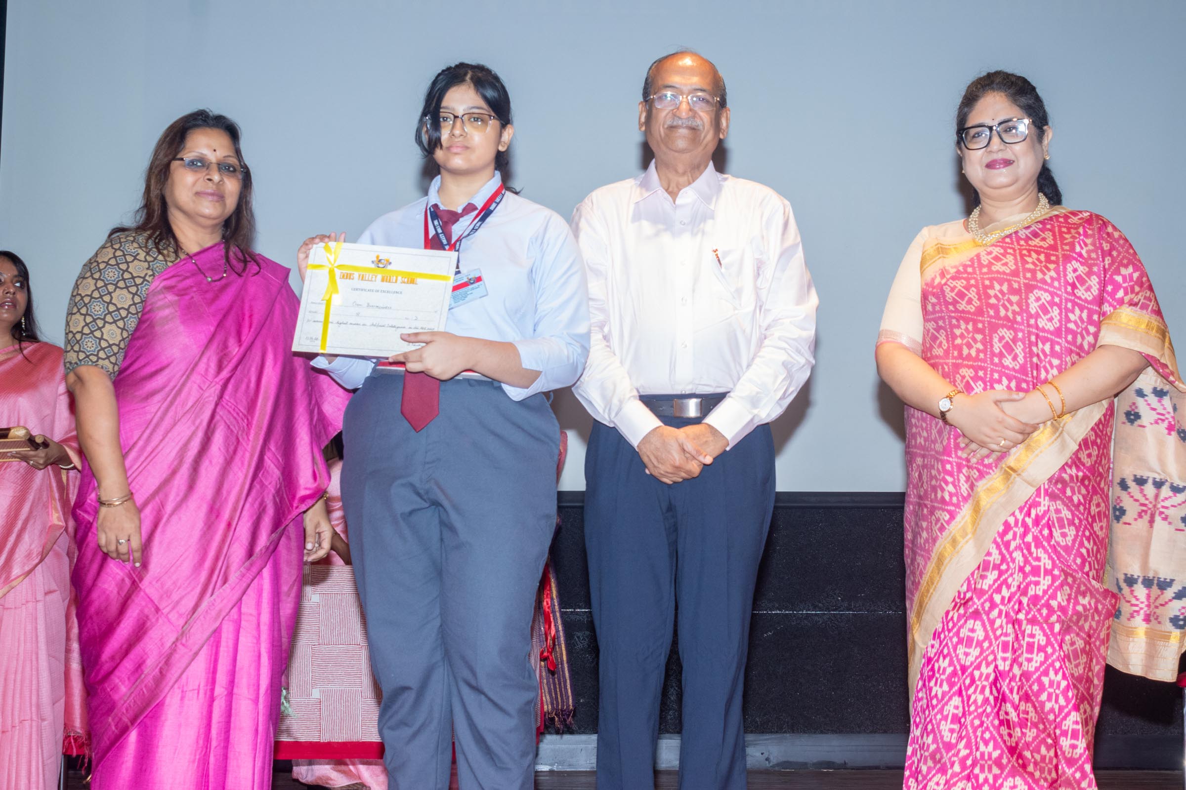 In the welcome address, Mrs Bhattacharya congratulated and appreciated the efforts of the students on their stellar performance in the boards and set the tone for the day. After the soulful rendition of the prayer song, students enthralled the audience by presenting Ganesh Vandana through their impeccable dance performance. Amidst a huge round of applause, the honoured guests and dignitaries were felicitated on stage by the Principal, Vice Principal and Mr S.L Gupta. The students displayed unabated excitement as the overall board toppers of grade X, Diyasmi Pal and grade XII, Koneenika Basak were felicitated with tabs, medals and certificates for scoring a whopping 98.8% and 99.2% respectively. Then it was the turn of the 34 high achievers being recognized for their stupendous aggregate of 95% and above followed by the subject toppers, many of whom scored a perfect 100 in subjects like Mathematics, Science, AI, Psychology, Sociology, Commercial Art, Home Science and Informatics Practices.