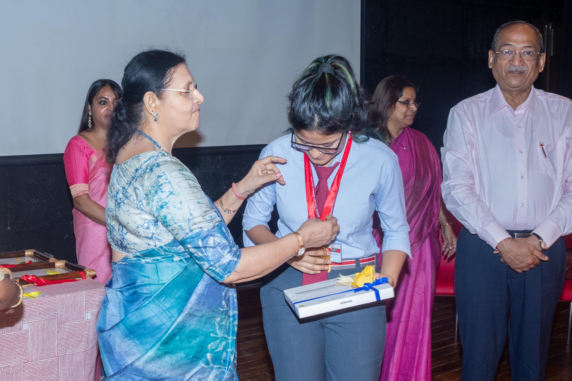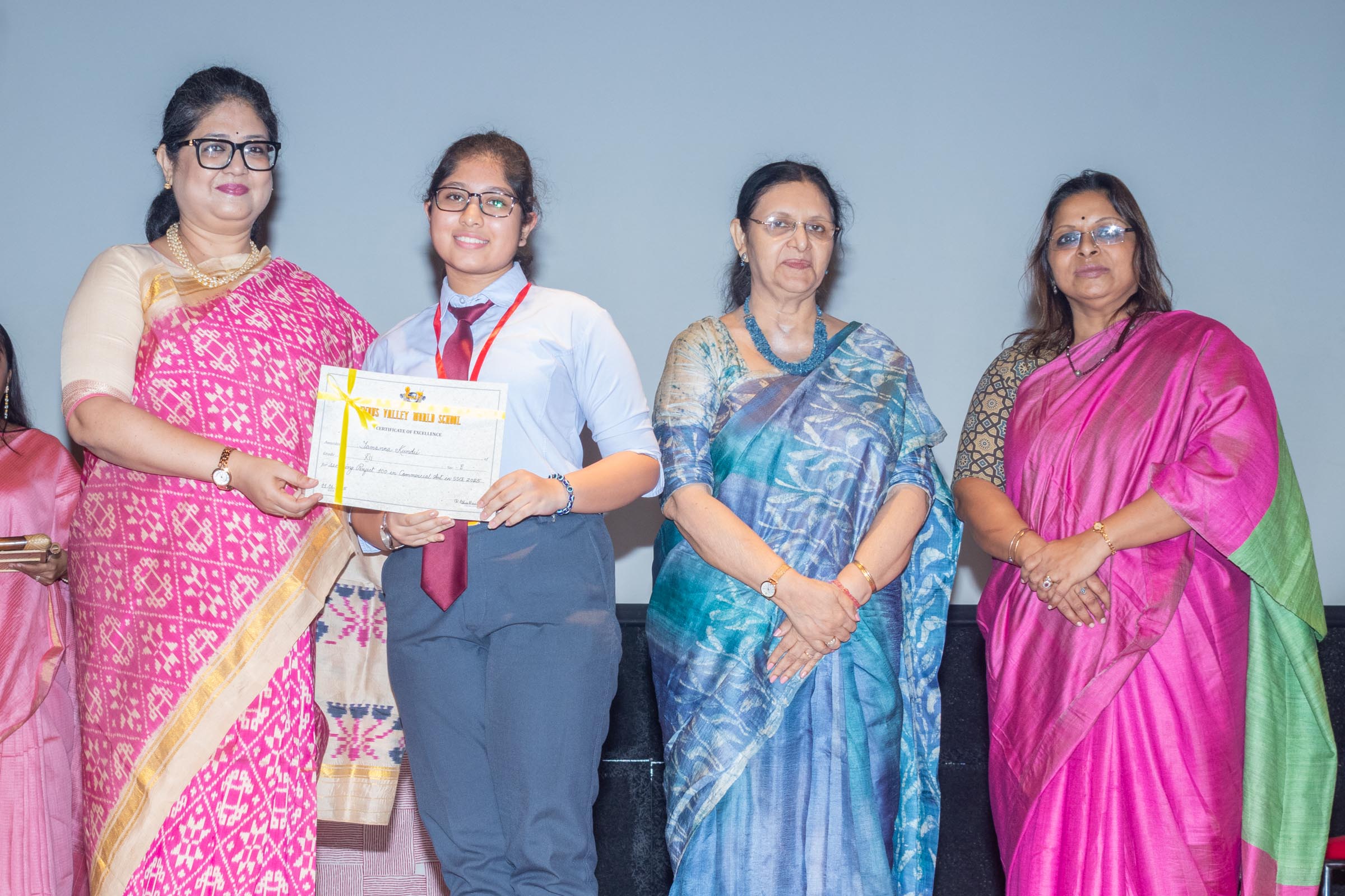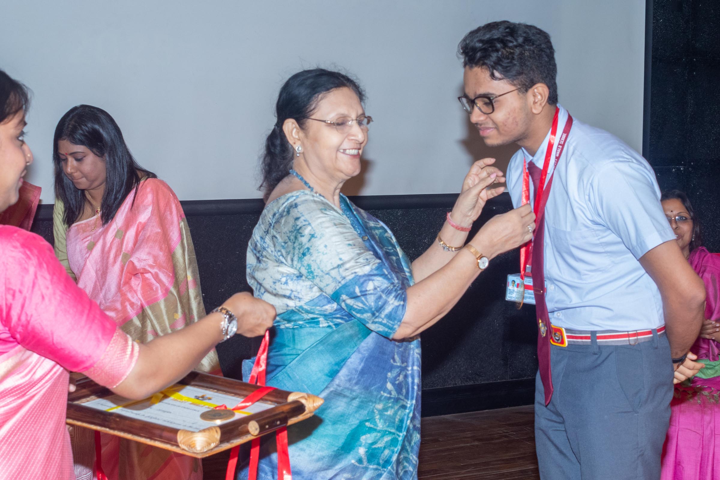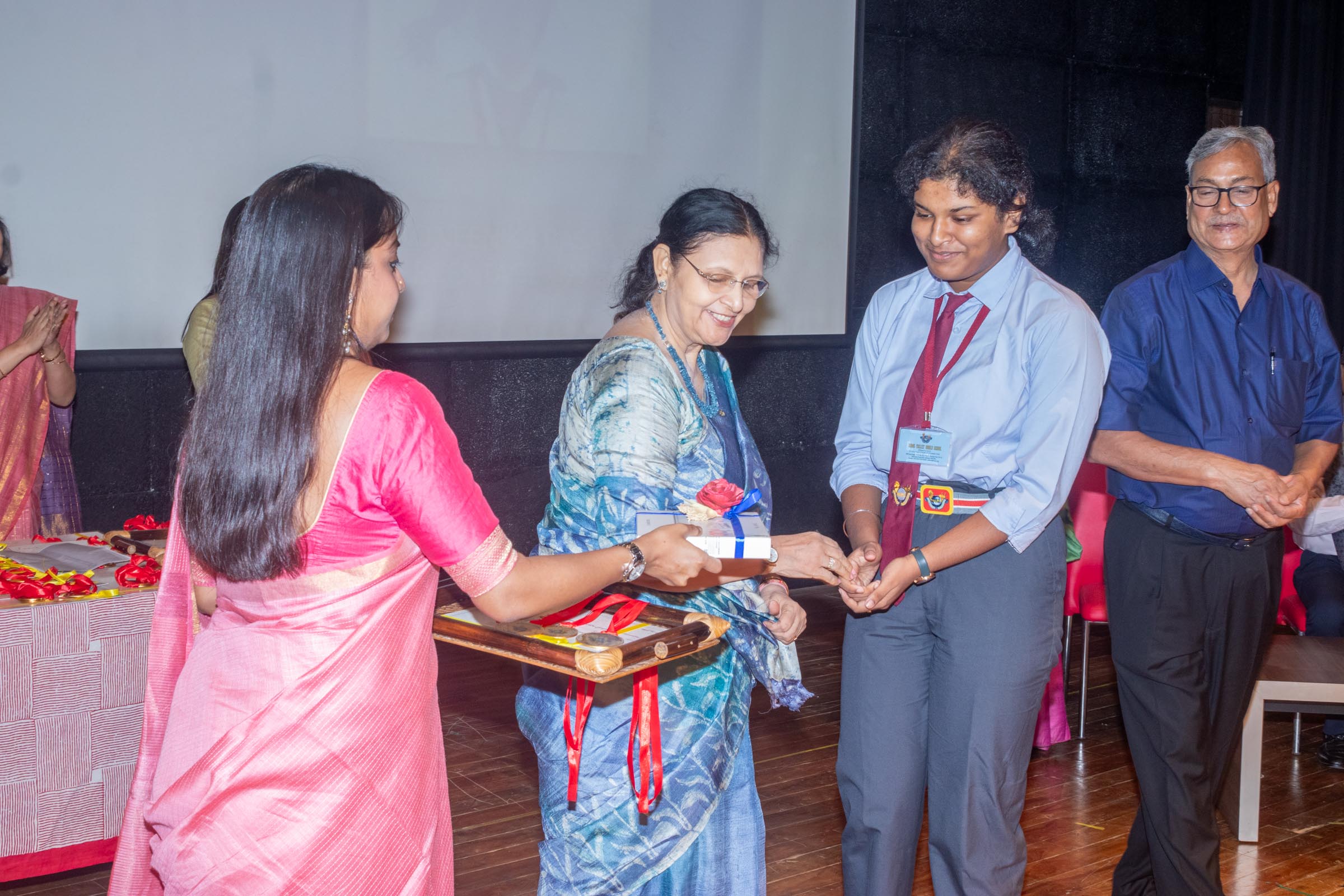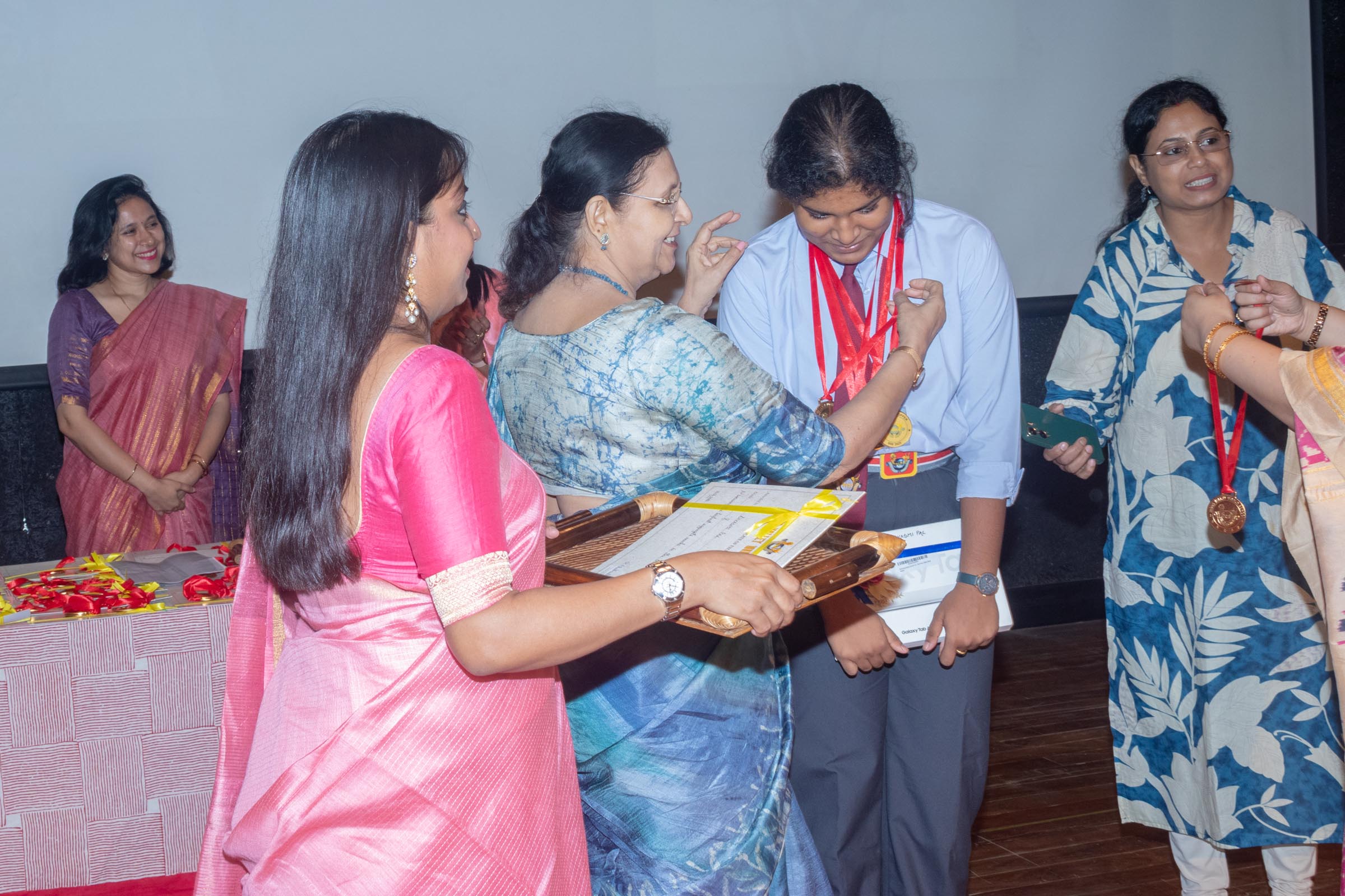 In the welcome address, Mrs Bhattacharya congratulated and appreciated the efforts of the students on their stellar performance in the boards and set the tone for the day. After the soulful rendition of the prayer song, students enthralled the audience by presenting Ganesh Vandana through their impeccable dance performance. Amidst a huge round of applause, the honoured guests and dignitaries were felicitated on stage by the Principal, Vice Principal and Mr S.L Gupta. The students displayed unabated excitement as the overall board toppers of grade X, Diyasmi Pal and grade XII, Koneenika Basak were felicitated with tabs, medals and certificates for scoring a whopping 98.8% and 99.2% respectively. Then it was the turn of the 34 high achievers being recognized for their stupendous aggregate of 95% and above followed by the subject toppers, many of whom scored a perfect 100 in subjects like Mathematics, Science, AI, Psychology, Sociology, Commercial Art, Home Science and Informatics Practices.