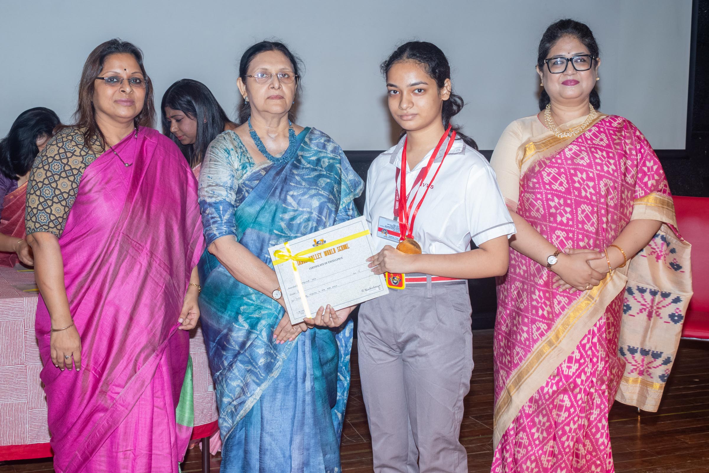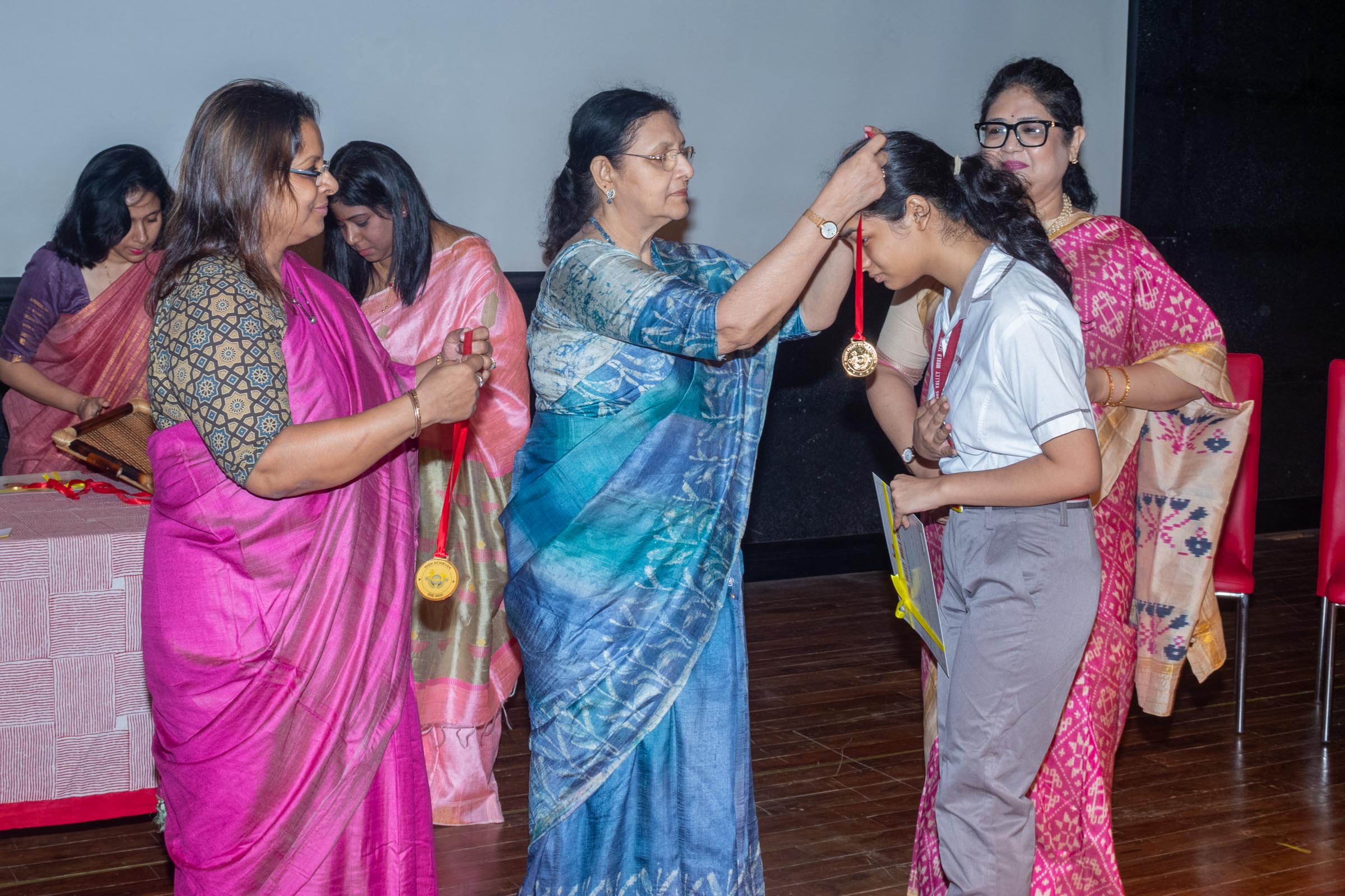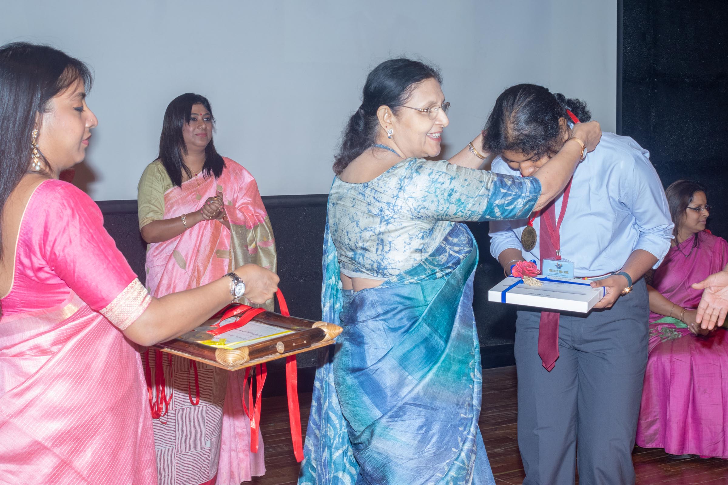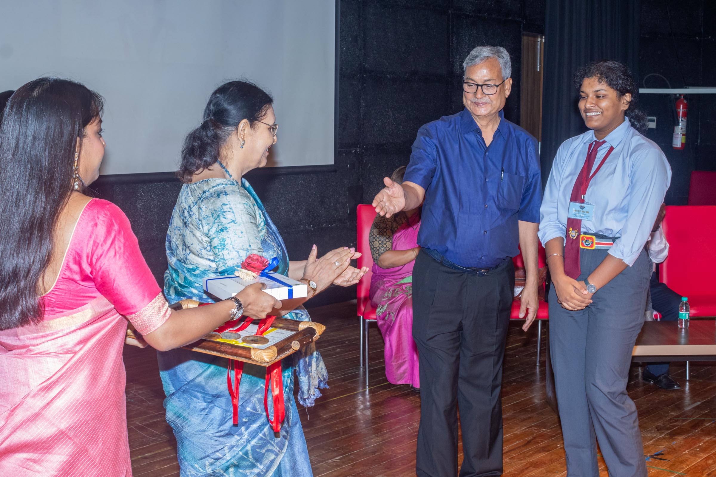 In the welcome address, Mrs Bhattacharya congratulated and appreciated the efforts of the students on their stellar performance in the boards and set the tone for the day. After the soulful rendition of the prayer song, students enthralled the audience by presenting Ganesh Vandana through their impeccable dance performance. Amidst a huge round of applause, the honoured guests and dignitaries were felicitated on stage by the Principal, Vice Principal and Mr S.L Gupta. The students displayed unabated excitement as the overall board toppers of grade X, Diyasmi Pal and grade XII, Koneenika Basak were felicitated with tabs, medals and certificates for scoring a whopping 98.8% and 99.2% respectively. Then it was the turn of the 34 high achievers being recognized for their stupendous aggregate of 95% and above followed by the subject toppers, many of whom scored a perfect 100 in subjects like Mathematics, Science, AI, Psychology, Sociology, Commercial Art, Home Science and Informatics Practices.