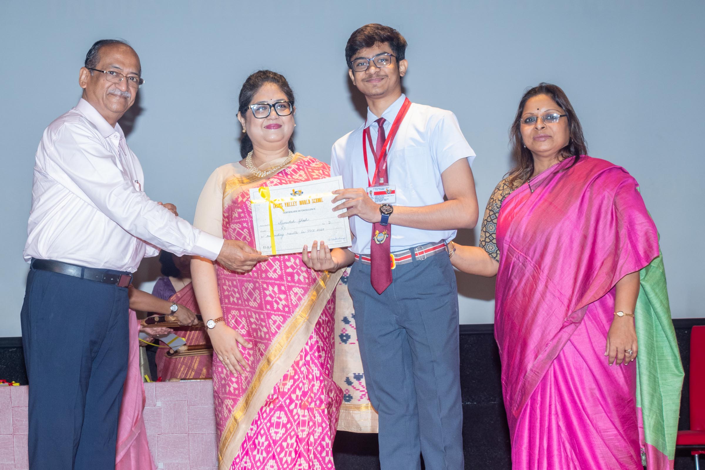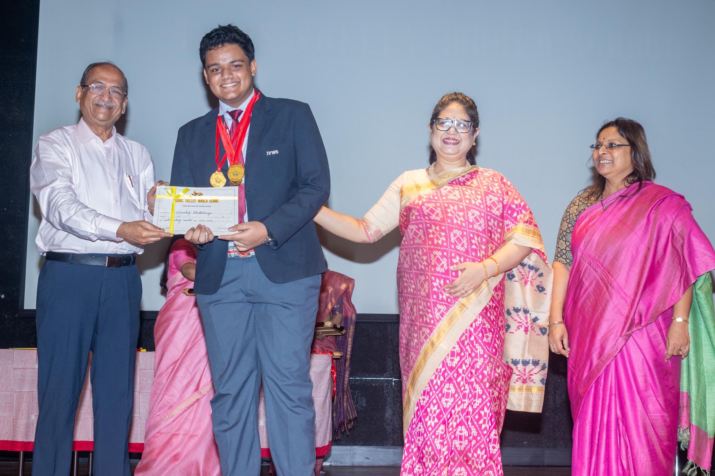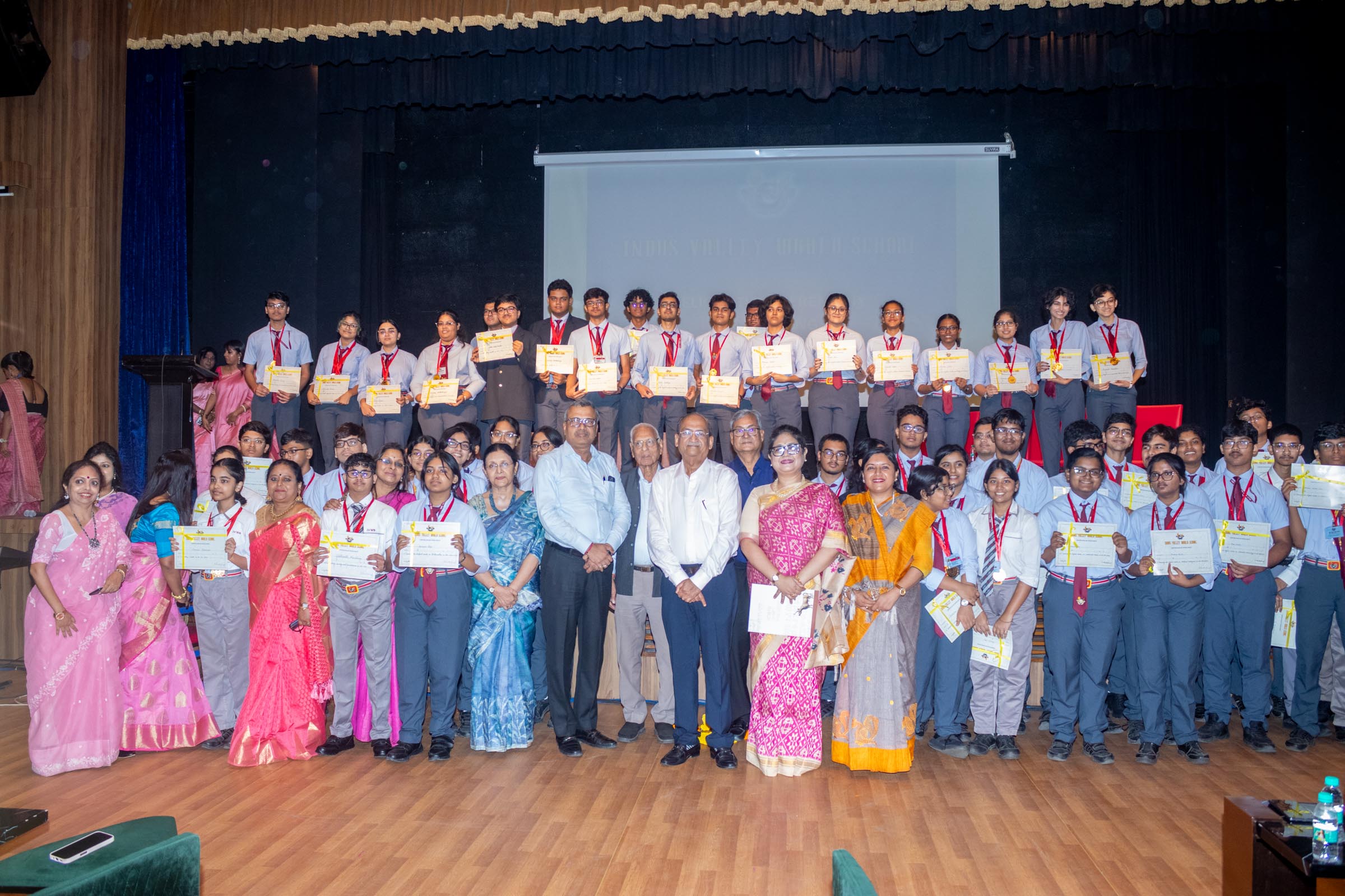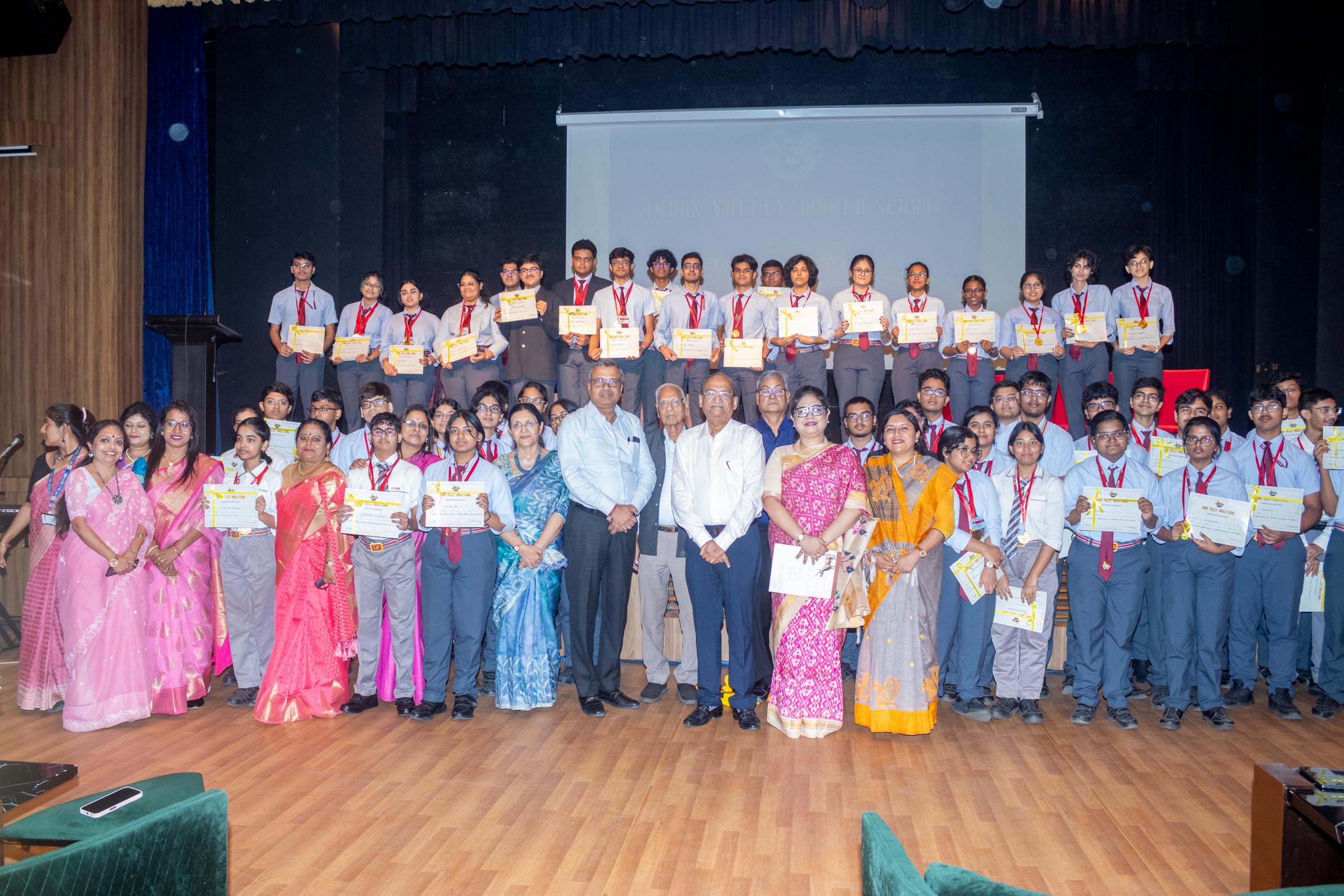 On 11th June, Indus Valley World School felicitated the board toppers and high achievers of SSE and SSCE of 2025 in its school auditorium in a grand ceremony. The occasion was graced by the Chief Guest, renowned educationist Ms Indrani Ganguly. IVWS was honoured and privileged to have Mr Sushil Poddar, a prominent figure in the trade association circuit as the Guest of Honour for the day and other dignitaries to encourage the students. The programme began on a traditional note with the lighting of the ceremonial lamp by the Chief Guest, Guest of Honour, CEO Mr S.L Gupta, Principal Ms Reshma Bhattacharya, Vice Principal and Administrator Ms Madhumita Seal, and other heads of the school.