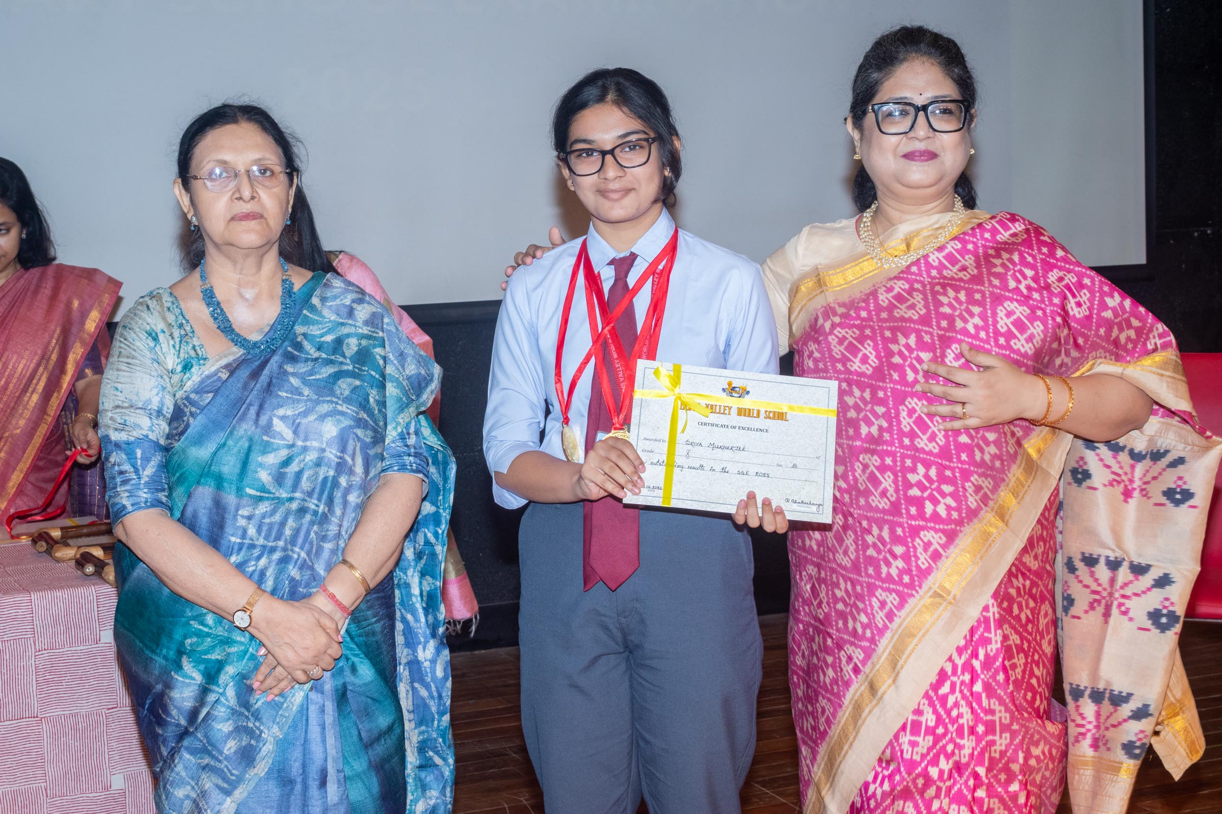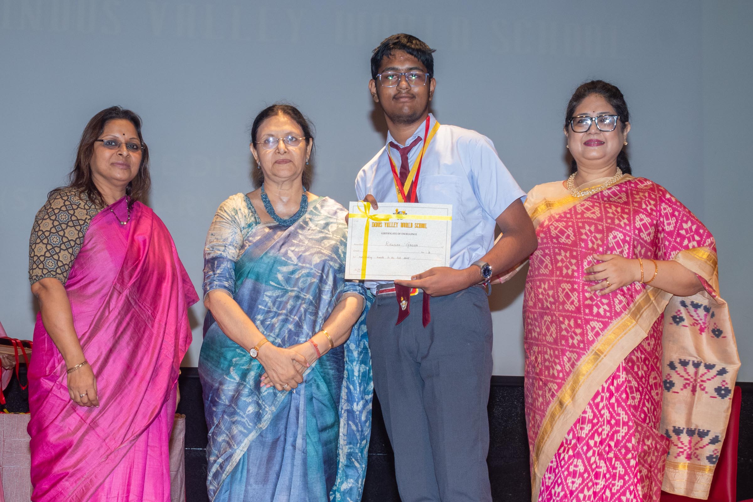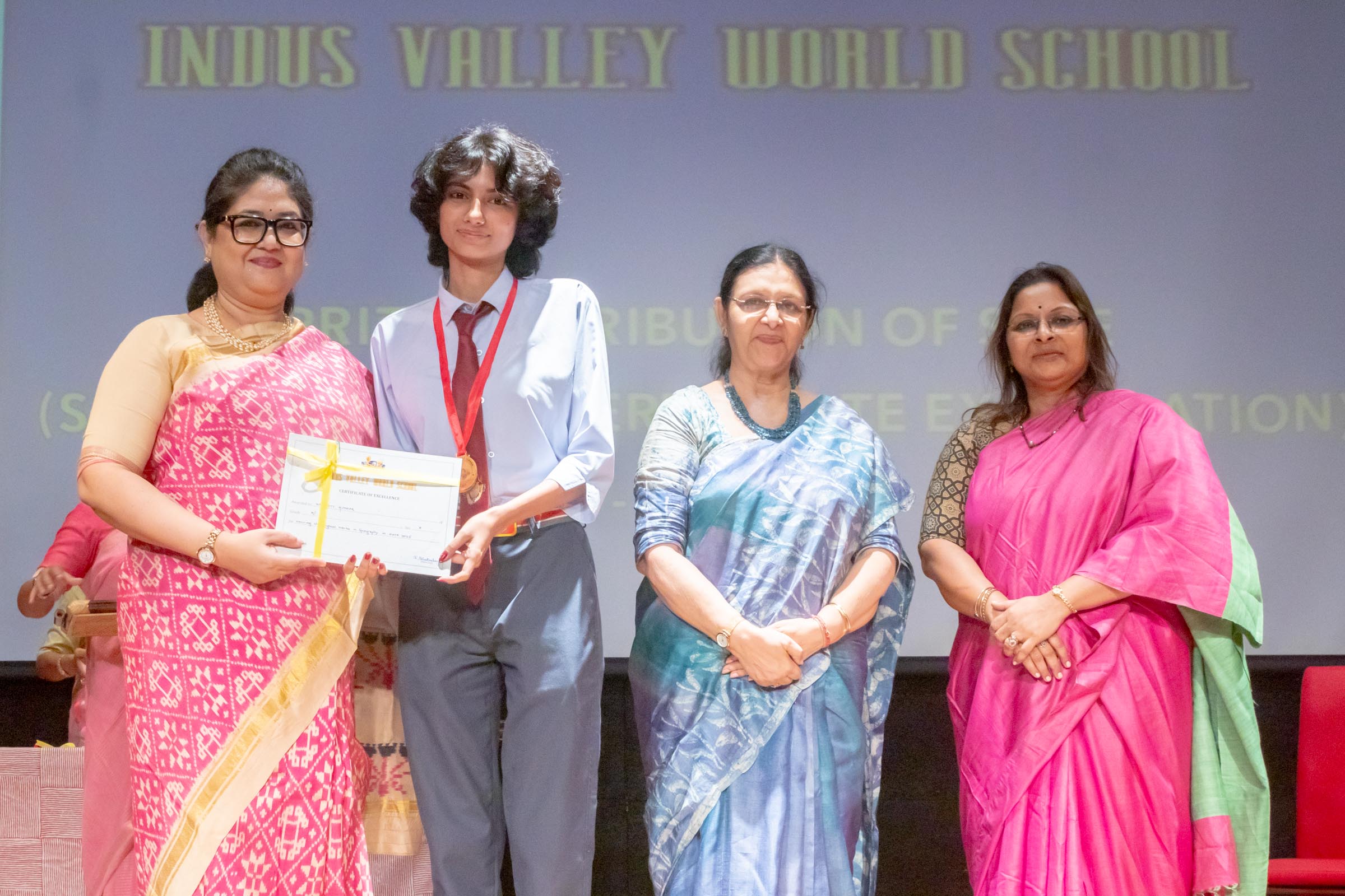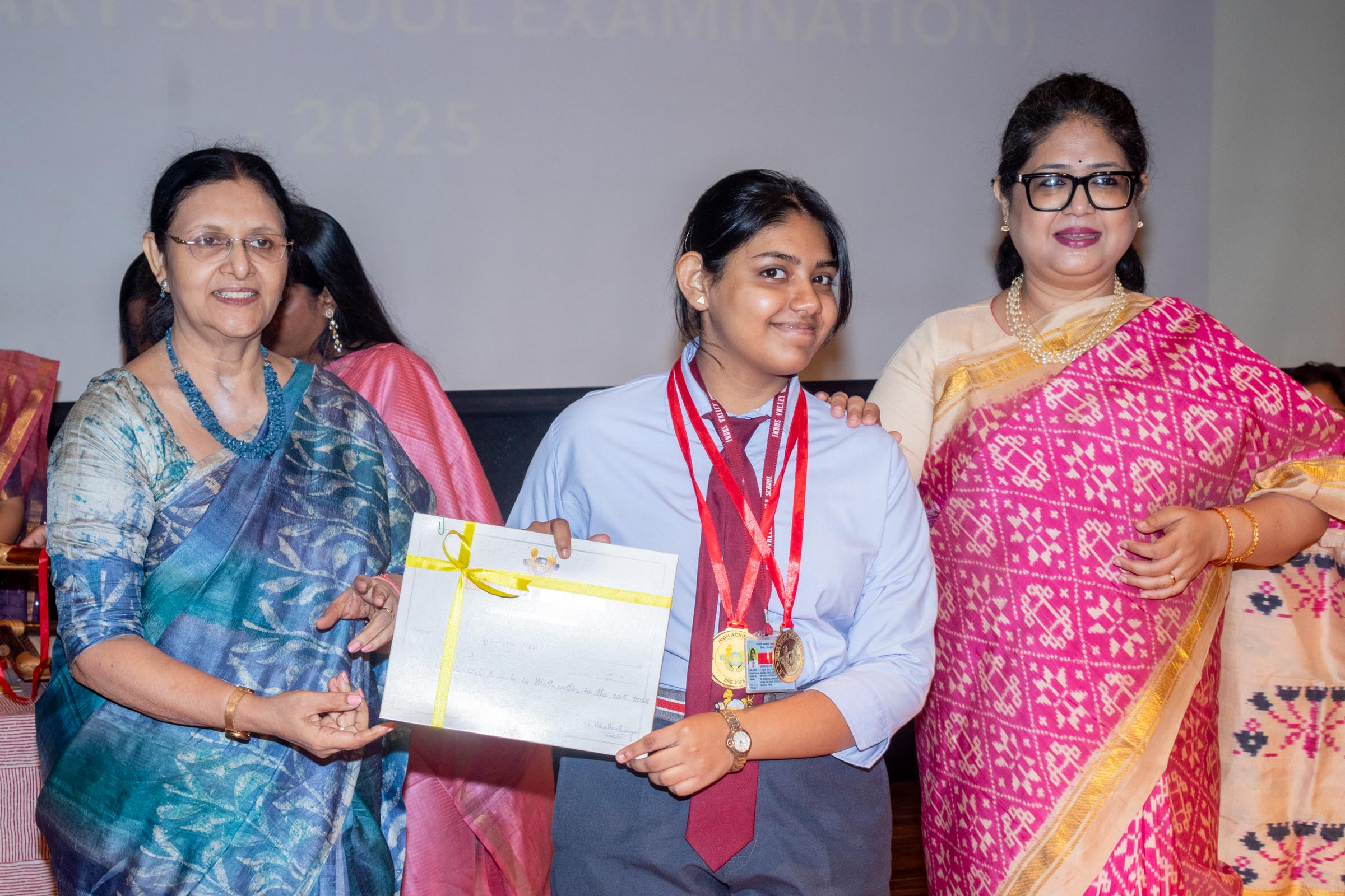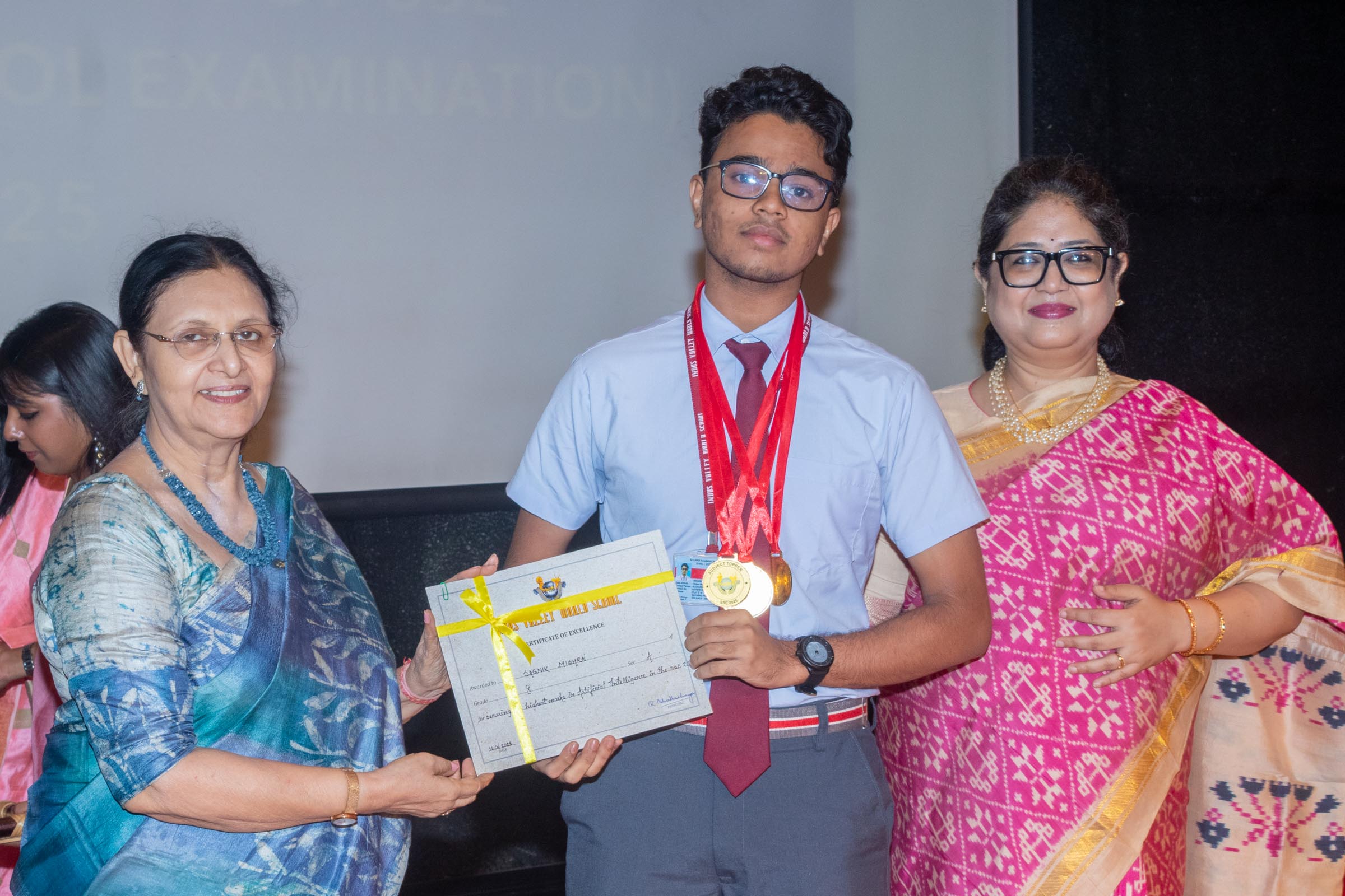 On 11th June, Indus Valley World School felicitated the board toppers and high achievers of SSE and SSCE of 2025 in its school auditorium in a grand ceremony. The occasion was graced by the Chief Guest, renowned educationist Ms Indrani Ganguly. IVWS was honoured and privileged to have Mr Sushil Poddar, a prominent figure in the trade association circuit as the Guest of Honour for the day and other dignitaries to encourage the students. The programme began on a traditional note with the lighting of the ceremonial lamp by the Chief Guest, Guest of Honour, CEO Mr S.L Gupta, Principal Ms Reshma Bhattacharya, Vice Principal and Administrator Ms Madhumita Seal, and other heads of the school.