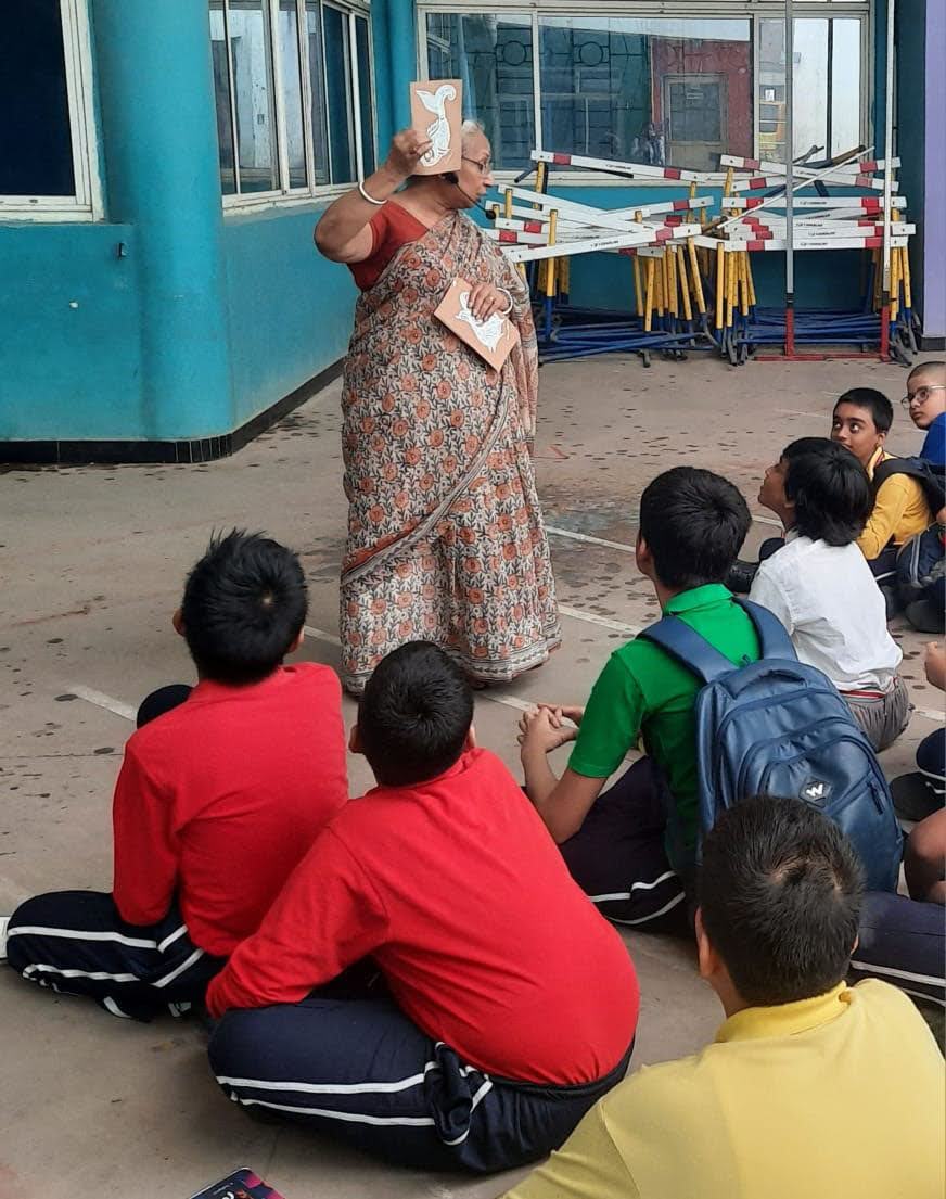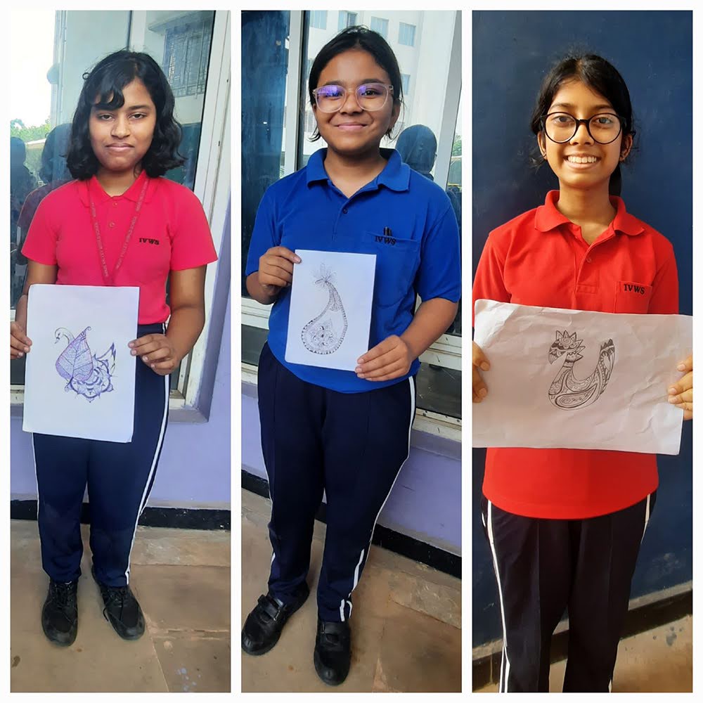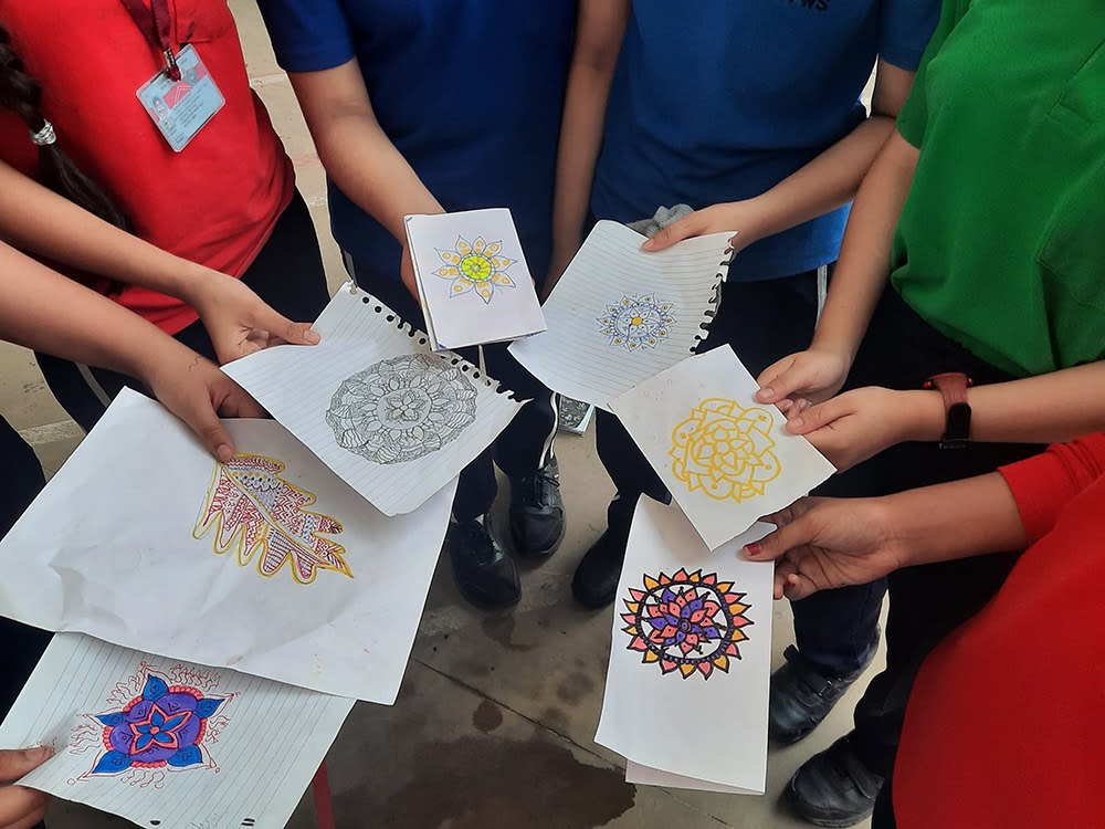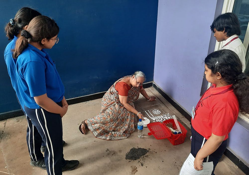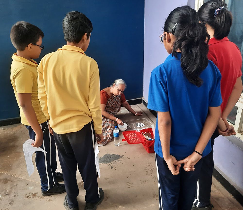 Grade 7 had a wonderful session with famous Alpona artist Ms. Ratnabali Ghosh as she explained the intricacies of the art and its various manifestations in different countries. The children tried their hand at designing their own on paper after her demonstration.