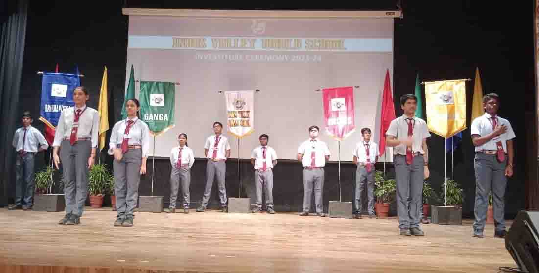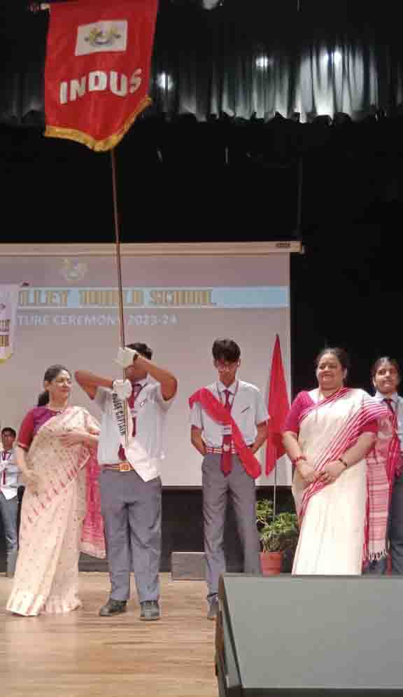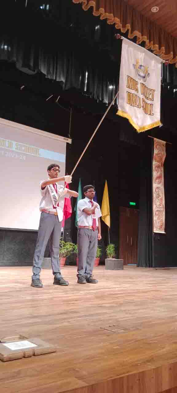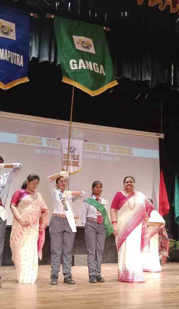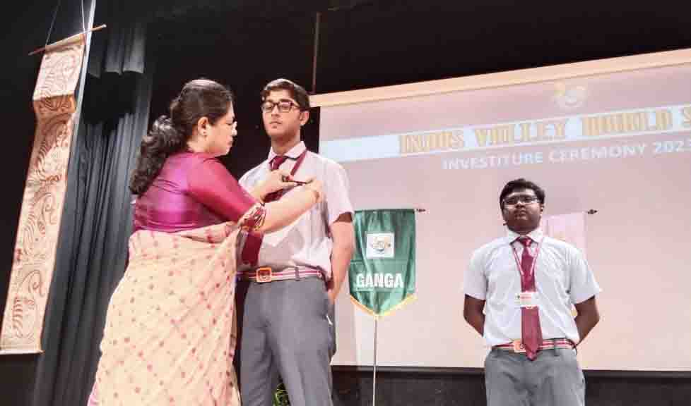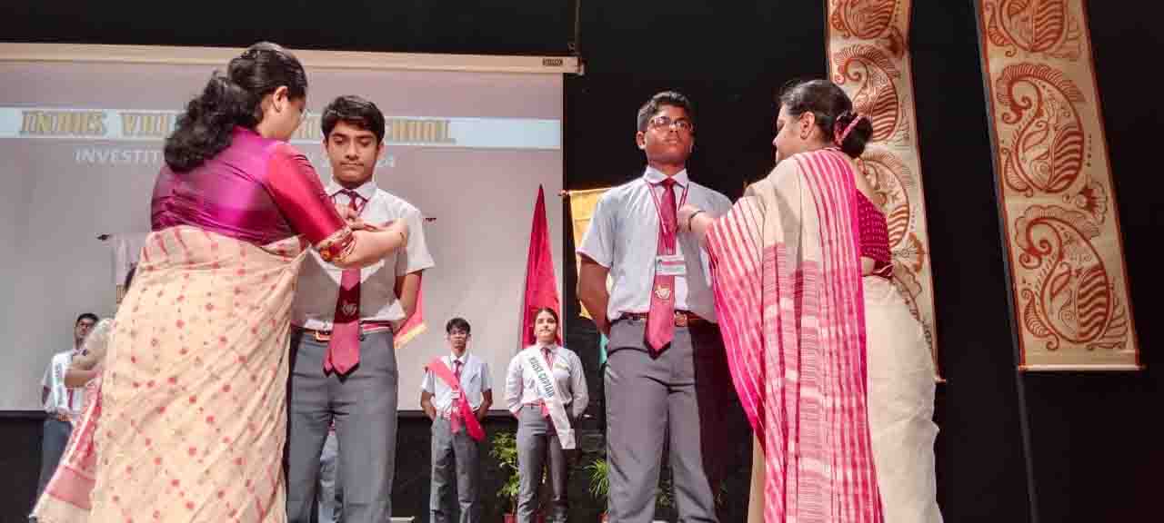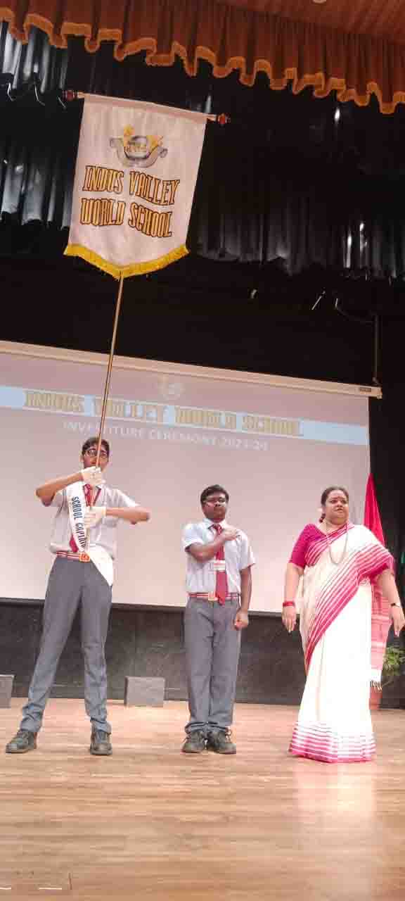 On 18th May 2023, Indus Valley World School conducted its investiture ceremony for the academic year, 2023-2024. At the outset of the programme there was a lamp lighting and prayer song followed by the address of Ms. Amita Prasad, the director of the school. She underscored the solemnity of the occasion when she said “The students who will be invested today have a quality that sets them apart — the quality to lead. Leadership is not about power; only people who serve can be good leaders.” The invested student leaders were Ishir Narayan (School captain), Utsa Ray (School vice-captain), Kashvi Ray (Captain co-curricular activities ), Sanchi Tiwary (Vice -captain of co-curricular activities) Prajit Bose (Sports captain) and S. Shree Ganesan (Sports vice-captain). The students appointed as the four house captains and vice captains respectively were Krishna Keshab Banik and Ryan Roy (Brahmaputra), Krishaa Nema and Parnika Dutta (Ganga), Toshan Chakraborty and Zayan Qaiser (Indus) and Aradhita Ray and Utsa Ray (Yamuna). They were badged by the Principal Ms. Reshma Bhattacharya and the Vice-Principal Ms. Priyadarshinee Guha. The students were administered the pledge by the Principal. The programme ended with a student’s prayer being read out by Madhupee Bhaumik of Grade XI which was followed by the School Song and the National Anthem.
